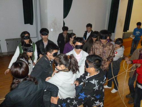 随后,拓展训练正式开始,培训的课题名称为“盲阵”。参赛人员蒙住双眼,经过团队内部的沟通和配合将一条绳子摆成正方形。在大家经过激烈的讨论后,开始实施解决方案,但在真正的操作中,却遇到了各类未曾预料的问题。培训人员又在努力理清思路,各抒己见,最后决策出可行方法,但因时间问题而未能完成任务。但通过该课题,大家有了更直观的体会,进而对团队合作有了更深度的理解。