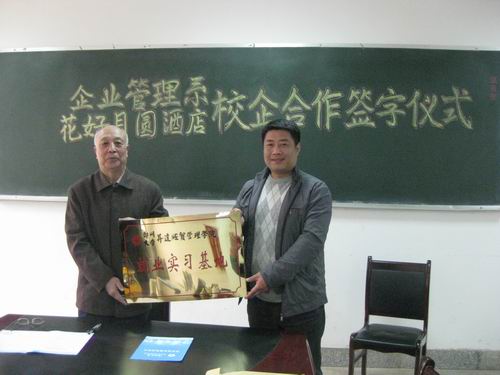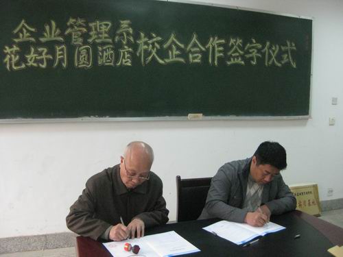 4月1日下午16:30,企管系与开封市礼仪之邦大酒店(花好月圆)有限公司在教学2-205室签署校企合作协议。花好月圆酒店执行总经理郝军明,常务副总经理杨来生,人力资源部经理谢芳,企管系高天喜主任,总支书记李苏贵同志,副书记张小雁老师、以及毕业班辅导员许广庆老师出席了仪式现场,会议由许广庆老师主持。