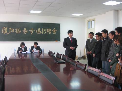 4月22日上午9:30,中原证券股份有限公司濮阳营业部在企管系会议室对我系应届毕业生进行了专场招聘。濮阳证券总经理于春燕、营销部经理宋跃进、营业部人事负责人于世玉负责招聘,企管系总支副书记张小雁老师主持了现场。