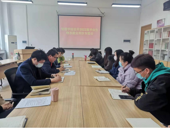 管理学院为进一步做好2022届毕业生就业工作,于2022年3月22日下午在我院2#305室召开精准就业帮扶专题会,管理学院党委书记张小雁老师、行政秘书许广庆老师及全体辅导员参会。