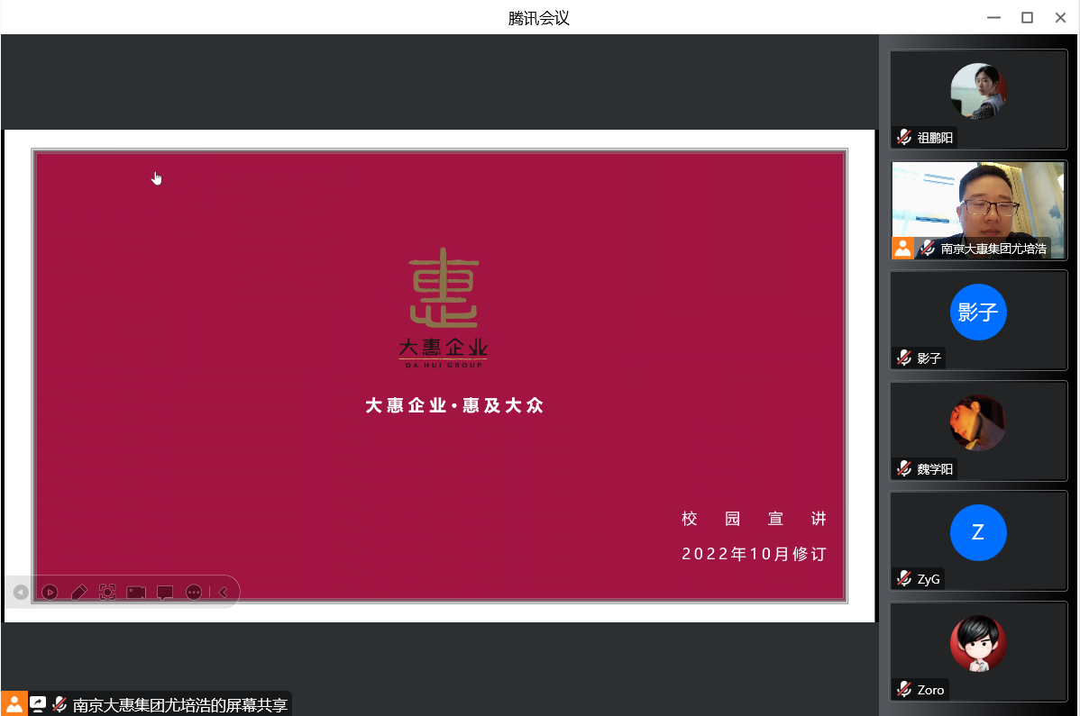 为做好疫情防控期间毕业生就业工作,全力以赴为2023届毕业生搭平台、谋岗位、送服务,2022年10月26日下午14:00-15:00,管理学院利用腾讯会议平台携手南京大惠集团开展直播带岗活动,南京大惠集团人力资源经理尤培浩和管理学院酒店管理、旅游管理专业毕业班学生参加活动。活动由管理学院毕业班辅导员祖鹏阳主持。