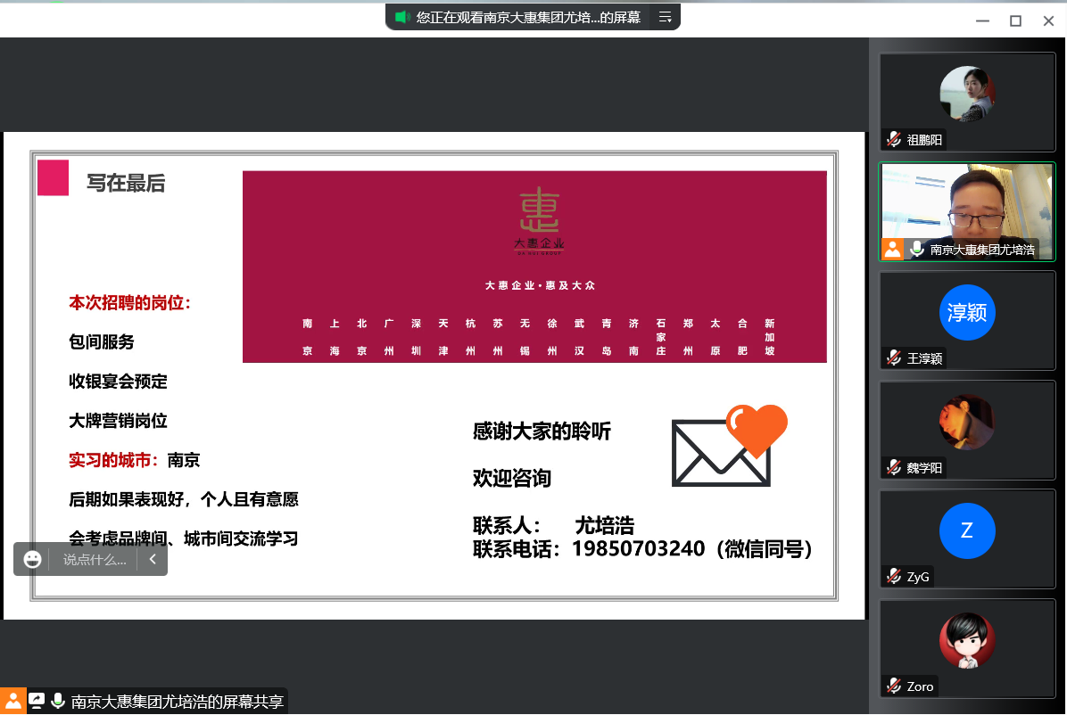 尤培浩经理首先以视频的形式分享了企业的宣传片《一封家书》、《路过的每一天》,接下来对集团旗下品牌和招聘需求作了详细介绍。大惠集团始创于1992年,投资发展四大业务版块:中高端餐饮品牌、三类不同定位的酒店、室内装饰、生产加工配送。截止至2022年5月,拥有全自营实体及店面近140家,涉及全国14个省18个城市、二线城市和海外新加坡。本次主要的岗位需求是包间服务、收银宴会预订和大牌营销。随后,尤培浩经理线上解答同学们的疑问,鼓励更多对酒店服务感兴趣的同学参与到大惠集团的大家庭。