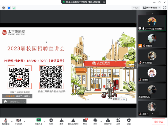 严峻的疫情形势下,为向2023届毕业生提供更多高质量岗位,2022年11月8日下午15:00—18:00,管理学院利用腾讯会议平台举办“直播带岗‘职’等你来”线上招聘会——房产经纪&酒店行业专场。本次直播带岗的参与企业有上海太屋网络科技有限公司、上海链家房地产经纪有限公司、洛阳万怡酒店、河南东方智汇旅游规划设计公司,此次活动由毕业班辅导员祖鹏阳主持,管理学院2023届毕业生参与。