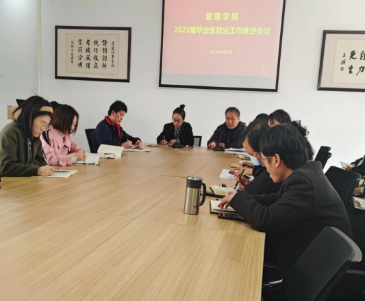 为深入学习贯彻党的二十大精神,落实党中央、国务院“稳就业”“保就业”决策部署以及省教育厅、学校就业工作会议和文件精神,全力促进2023届毕业生顺利就业、尽早就业,管理学院于3月2日下午在教学2号楼209召开了2023届毕业生就业工作推进会议。管理学院党委书记职正路、院长朱影影及全体教职工参加会议,会议由院党委书记职正路主持。