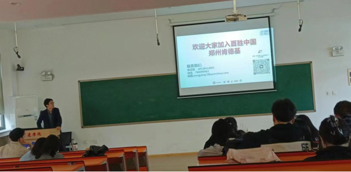 在宣讲会开始之前,宣讲人李经理与提前到的同学们闲聊,诙谐的语言让气氛变得热闹起来,在宣讲会正式开始后,李经理先是播放了百胜中国的招聘宣传视频,表示此次招聘主要为百胜中国旗下的郑州肯德基有限公司招聘运营管理实习生,也让同学们对郑州肯德基有了更深的了解。