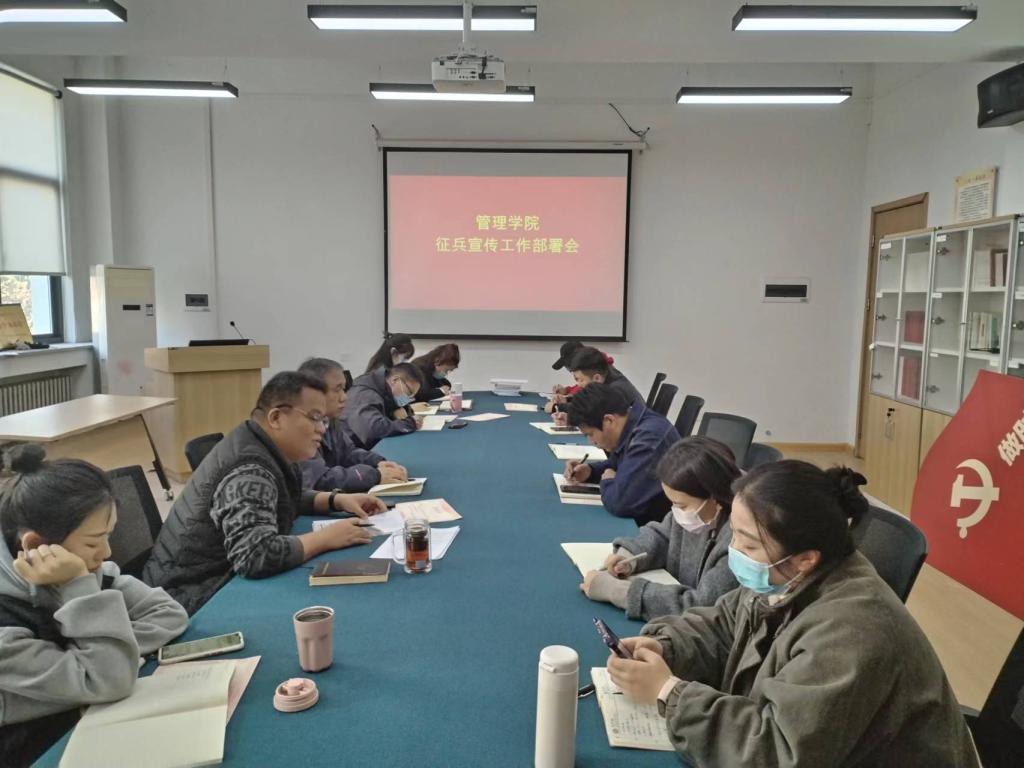为进一步贯彻落实国家《征兵工作条例》的相关政策方针,增强大学生爱国的责任意识,推动国防和军队现代化的基础性工程建设。管理学院于2023年12月5日在2号楼305室召开征兵宣传工作部署会,管理学院党委书记职正路、行政秘书许广庆及全体辅导员参与此次会议。
