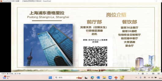 首先酒店负责人Christy介绍了香格里拉酒店名字的由来,来自于小说地平线,接着播放了一个短片让学生初步了解了香格里拉酒店。接着从地理位置、就业体验、温馨之家、培训发展、薪酬福利、五个方面对酒店进行了全方位的介绍。首先,该酒店地理位置极为优越,地处上海中心区域,交通十分便利。其次,香格里拉酒店工作机会众多,这里有来自不同国家的员工,能够进行工作经验交流,有助于提升我们的职业技能。再者,香格里拉酒店犹如一个温馨之家,为员工提供吃穿住行等诸多福利,给予员工丰富的饮食体验,上班有班车接送,还有迪士尼一日游的福利。此外,香格里拉酒店提供完善的员工培养体系,可有效提高员工的职业技能。