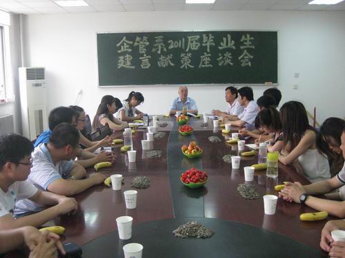 6月14日上午9点,企管系在教学二号楼系会议室召开了2011届毕业生建言献策座谈会,企管系高天喜主任、党总支副书记张小雁、教学秘书唐云、行政秘书职正路、教师代表李东芳老师及12名优秀毕业生代表参加了座谈会。座谈会由职正路老师主持。