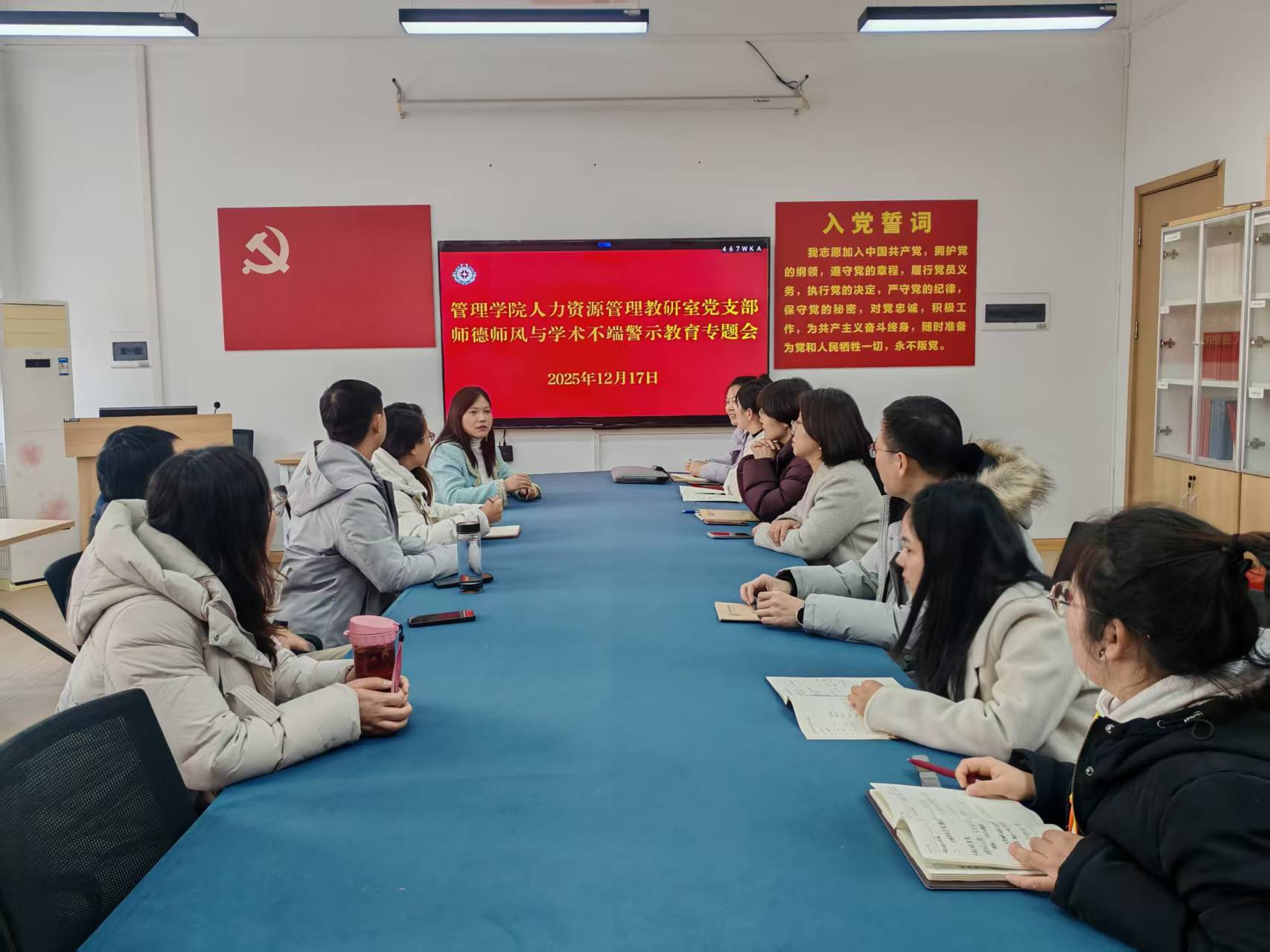 为深入学习贯彻新时代教师职业行为准则,进一步加强师资队伍思想政治与职业道德建设,筑牢学术道德底线,2025年12月18日下午,管理学院人力资源教研室党支部在教学2号楼305室组织开展了“筑牢师德根基,严守学术规范”专题警示教育活动。支部全体党员教师参加了本次活动。