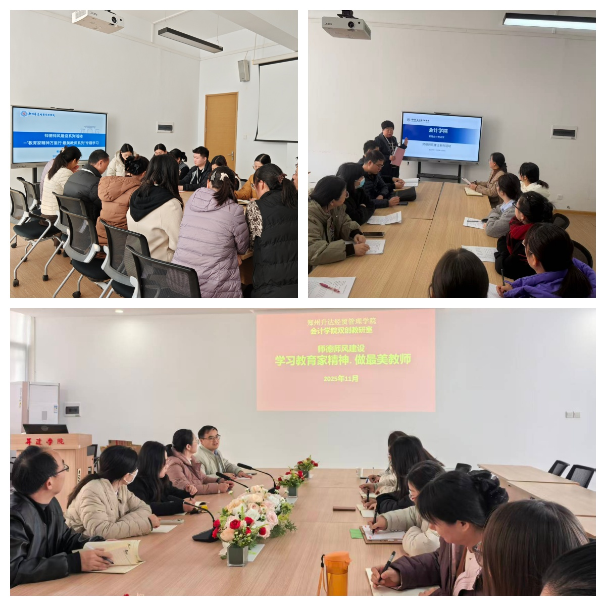 为深入学习贯彻习近平总书记关于教育的重要论述,大力弘扬教育家精神,近日,会计学院以“传承教育初心,凝聚育人力量”为核心,正式启动“教育家精神万里行・最美教师系列”专题学习活动,本次专题学习活动由各教研室主任组织开展,教研室全体教师参加。各教研室高度重视,进行“线上+线下”的多形式、全覆盖的学习研讨和交流。