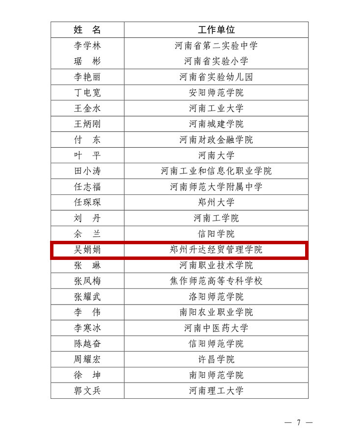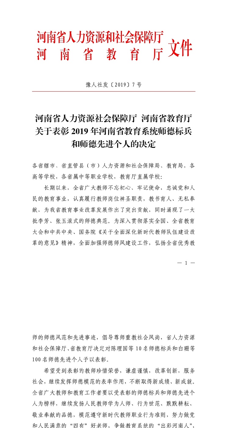 近日,河南省人力资源和社会保障厅、河南省教育厅印发《关于表彰2019年河南省教育系统师德标兵和师德先进个人的决定》(豫人社发〔2019〕7号)。我校基础部吴娟娟老师荣获2019年“河南省教育系统师德先进个人”荣誉称号。