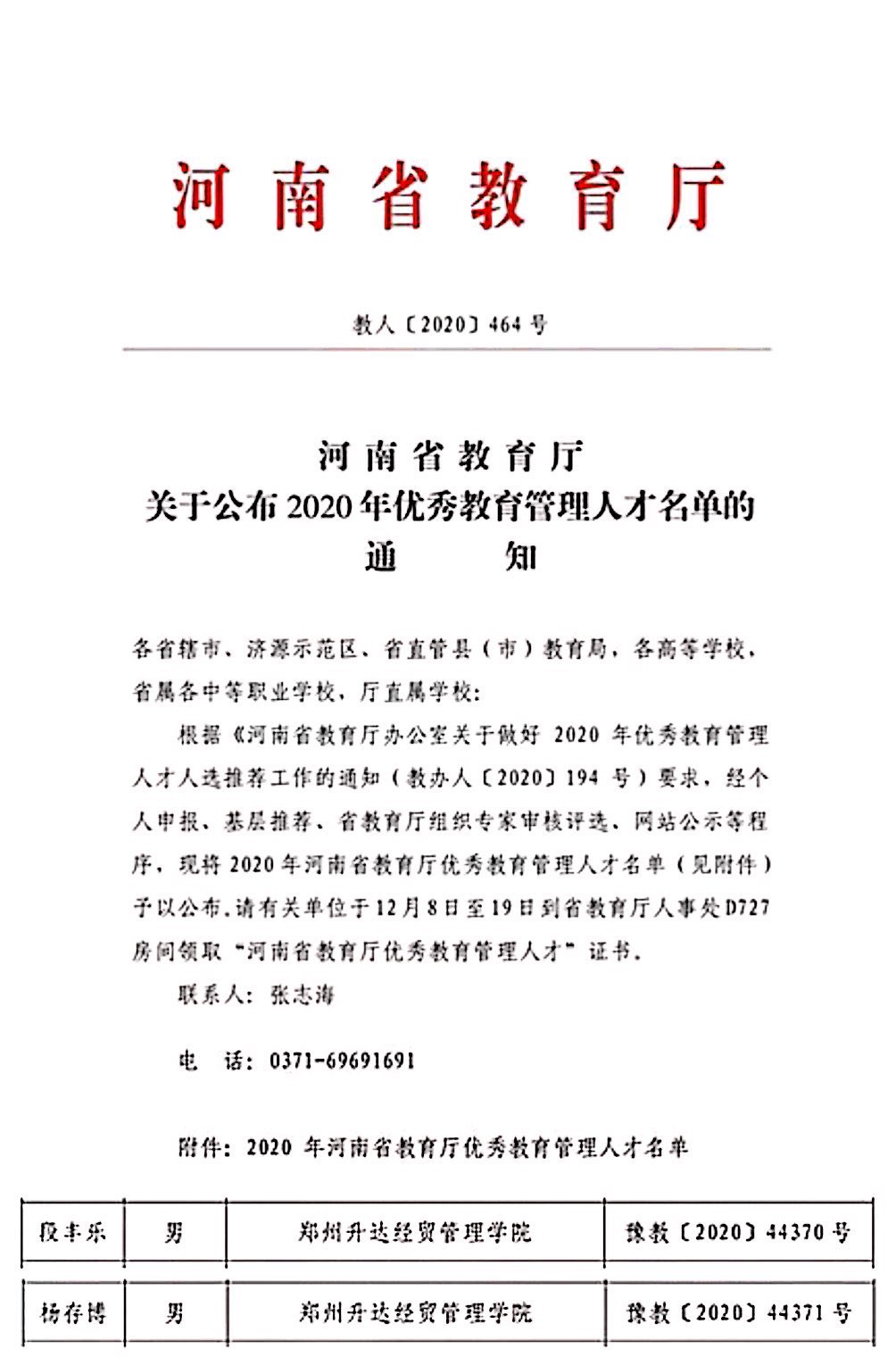 近日,从《河南省教育厅关于公布2020年优秀教育管理人才名单的通知》(教人〔2020〕464号)中获悉,我校段丰乐、杨存博被评为河南省教育厅优秀教育管理人才。