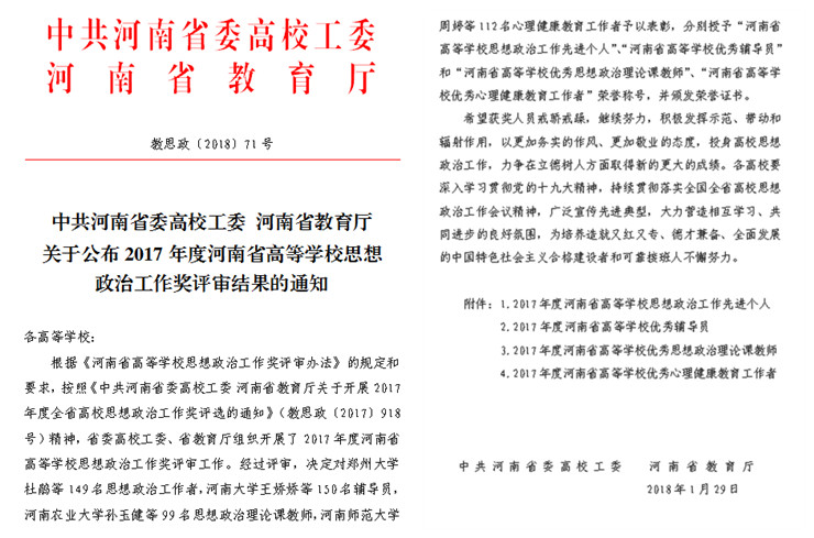 近日,由河南省委高校工委、河南省教育厅组织开展的“2017年度河南省高校思想政治工作奖”评选结果揭晓,我校喜获佳绩。