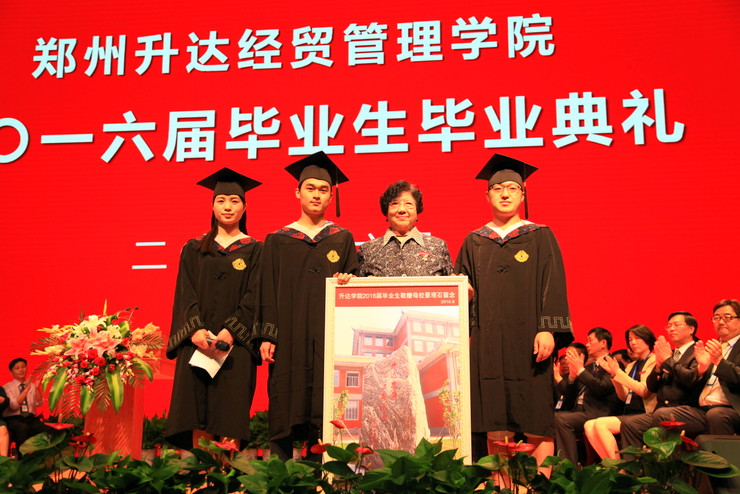 随后,毕业生向母校赠送纪念品——景观石一方,上书“升达恩泽 山高水长”。衷心祝福亲爱的母校、敬爱的恩师坚如磐石,实至名归。