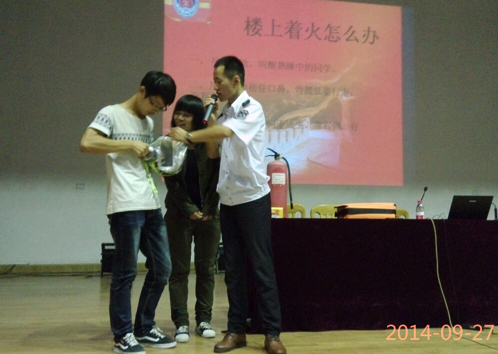 赵教员结合近年来发生的重大火灾事故及高校的具体情况,为大家讲解了高校消防应该注意的事项,阐释了火灾事故的预防及事后应对办法,列举了同学们在面对火灾时一些错误的观念和做法,并重点讲解了学生宿舍发生火灾的起因及应对办法,强调了宿舍的安全用电以及发生火灾时逃生自救和正确使用灭火器材的方法。提醒同学们要做到预防为主、防消结合,养成人走电断、不私拉乱扯、不用违章电器、不在宿舍抽烟等文明生活习惯,切实提高消防安全意识。赵教员还积极与同学们互动,手把手地指导同学们使用灭火器和防毒面具。