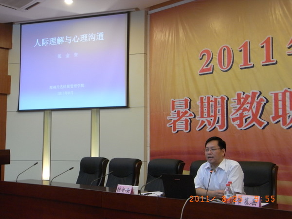 张金安副院长在会上做了《人际理解与心理沟通》的主题报告。他运用心理学的专业知识,结合多年的工作经验,有针对性地为大家讲解了沟通的内涵、功用、过程和意义,并着重讲述了师生、同学沟通中沟而不通、不良沟通,如何有效沟通等问题,深入阐释了冰山理论、萨提亚的NLP冰山理论、九型人格和不良沟通的四种应对模式,要求辅导树立积极的沟通理念,尊重、理解人的多样性,建立有效的沟通模式。