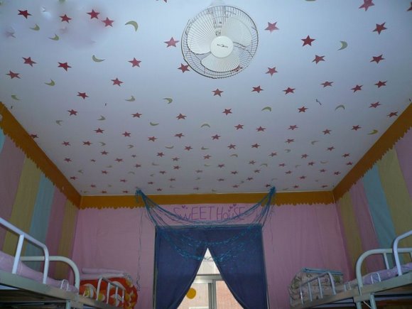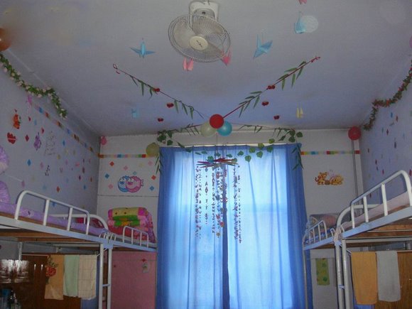 15号楼539宿舍以“绚烂”为主题,天花板上布满了宿舍成员们手工制作的星星。她们说:“这是我们想象的星空,在遥望星空中我们憧憬着绚烂的未来,追逐着绚烂的梦想。而这一切要从我们的‘绚烂之家’开始”;窗户上在花朵间曼妙轻舞的蝴蝶,墙壁上两只快乐的维尼熊,房顶上几个粉红色的蝴蝶结,这就是15号楼107宿舍的装扮,她们以“幸福来敲门”为主题,装饰着属于她们自己的“人间天堂”;推开18号楼237宿舍的门,映入眼帘的是墙上几幅散着墨香的画和几条生机盎然的绿色枝条,这个命名为“绿色小屋” 的宿舍力求简单,倡导环保,充满了勃勃生机……其他宿舍的布置也充满诗情画意,洋溢着青春气息,体现了同学们勇于创新的魄力和拼搏奋斗的进取心。各参评宿舍独具匠心,将自己的“家”当作一件艺术品,去创作,去呵护。