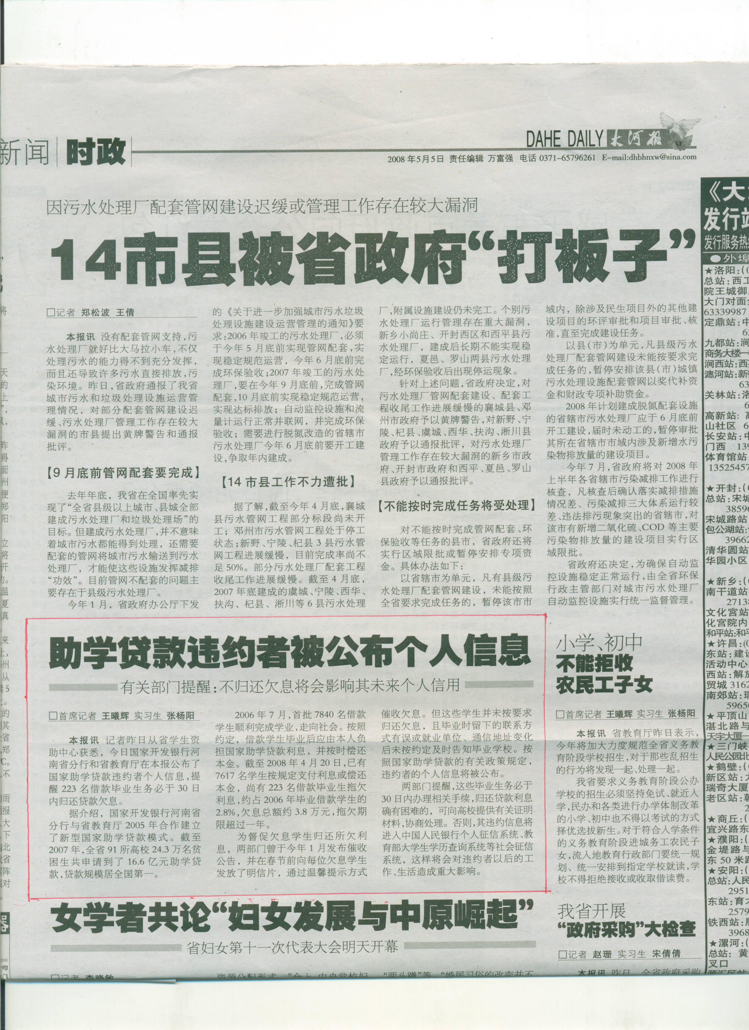 (附:2008年5月5日《大河报》——助学贷款违约者被公布个人信息、欠息催收公报)