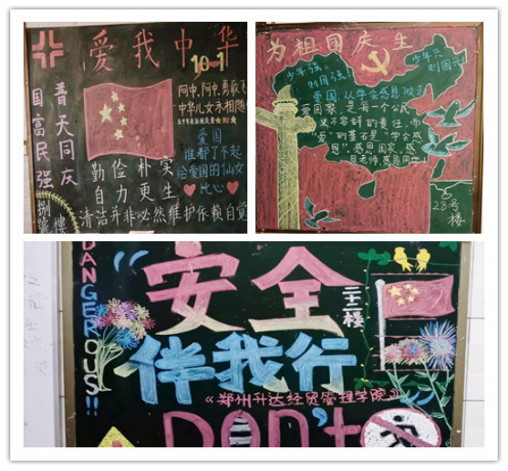 各楼管理员积极发动学生,参与宿舍楼安全和爱国主义宣传。楼内展示专题板报,排查了安全隐患,保障学生宿舍楼内的正常秩序,确保师生过一个平安快乐的假期。