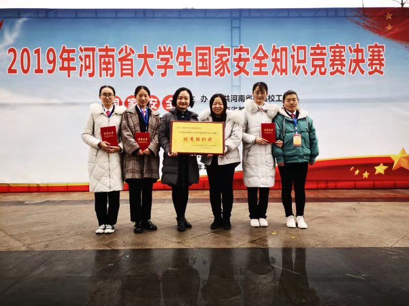 12月15日-12月16日, 2019年河南省大学生国家安全知识竞赛决赛在河南财经政法大学举行。我校由文法学院解庆婷、曹灿灿、外国语学院张雅迪、管理学院方雨4名同学组成的代表队,在文法学院行政秘书郑玲玲、辅导员李玉杰带领指导下,积极参赛、沉着应战,与郑州大学等9所高校的选手展开激烈角逐,最终取得第二名的好成绩。我校同时荣获优秀组织奖,郑玲玲、李玉杰两位老师荣获优秀指导老师奖。