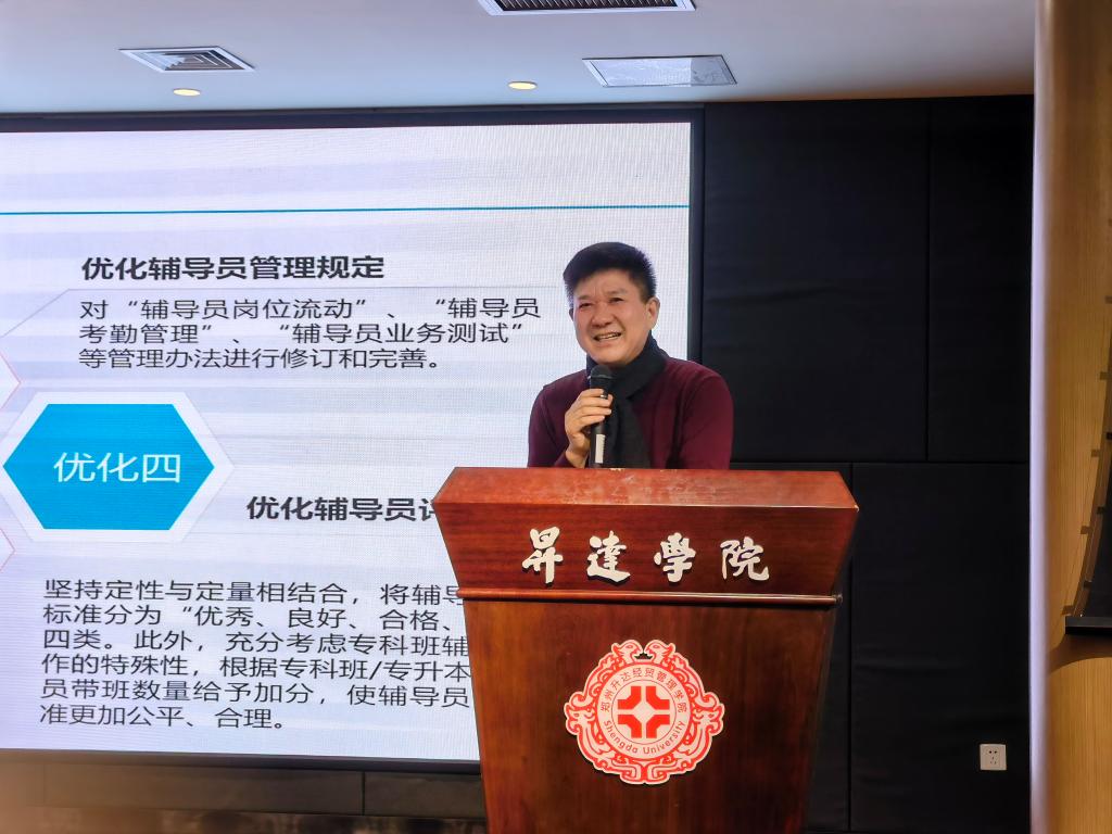 面对新情况、新问题,凝聚共识,落实严管势在必行。如何通过严管打造育人特色,他概括为“一项确保”“两项改进”“三项深入”“四项优化”“五项严管”。一项确保,即疫情防控不放松,确保校园安全稳定;两项改进,即改进辅导员评价机制,改进劳动教育模式;三项深入,即例会开在学院里,辅导员工作室设在学生宿舍,落实全员深入宿舍制度;四项优化,即优化学务处人员配置,优化辅导员管理规定,优化辅导员测试办法,优化辅导员评价标准;五项严管,即严禁烟酒,严禁超速,严查翻墙,严查安全隐患,严肃处理。