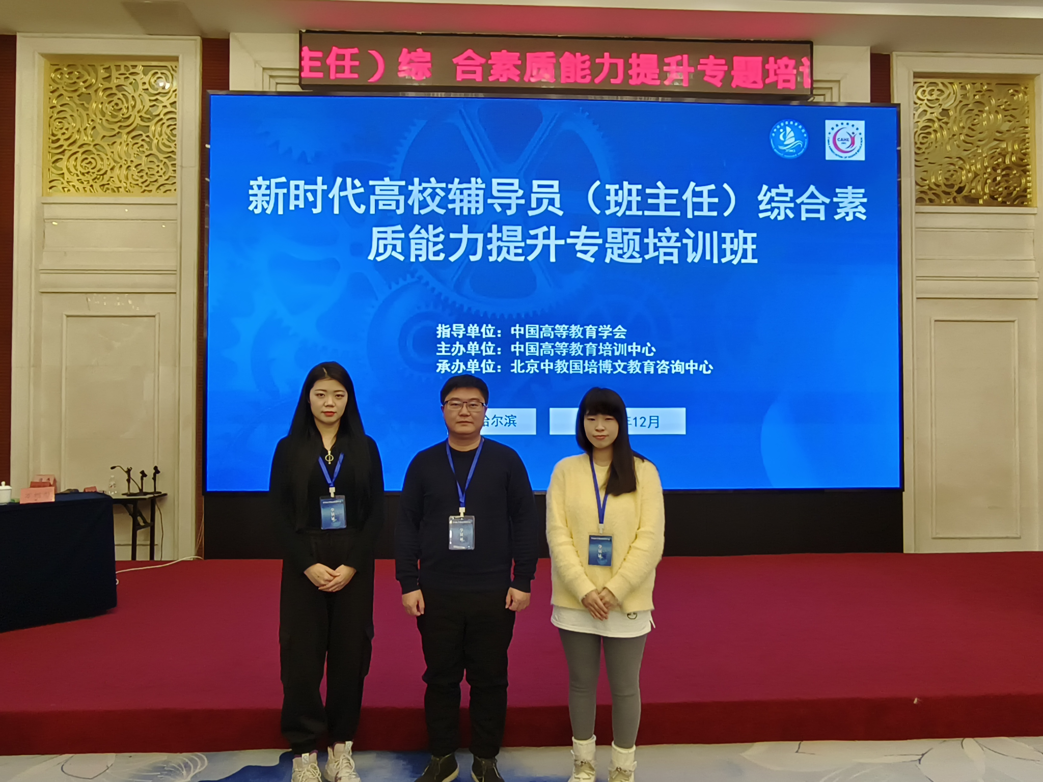 为全面提升高校思政工作质量,深化落实立德树人根本任务,强化辅导员队伍专业化、职业化建设,不断提升辅导员队伍的政治素养、业务能力及育人水平,2024年12月6日-9日由中国高等教育培训中心主办的新时代高校辅导员(班主任)综合素质能力提升专题培训班在哈尔滨举行。我校学务处张颢、会计学院辅导员董婉婉、艺术学院辅导员毛阁辉参加此次培训。
