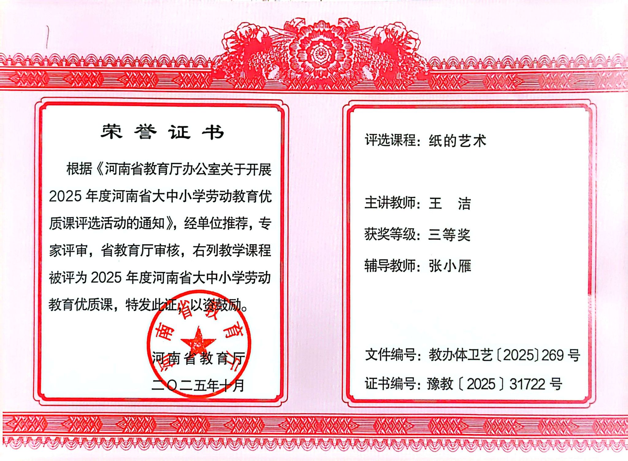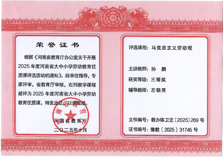 近日,河南省教育厅公示了2025年度河南省大中小学劳动教育优质课获奖人员名单,我校学生发展中心孙鹏、艺术学院王洁分获劳动教育优质课赛项、学科融合优质课赛项三等奖。