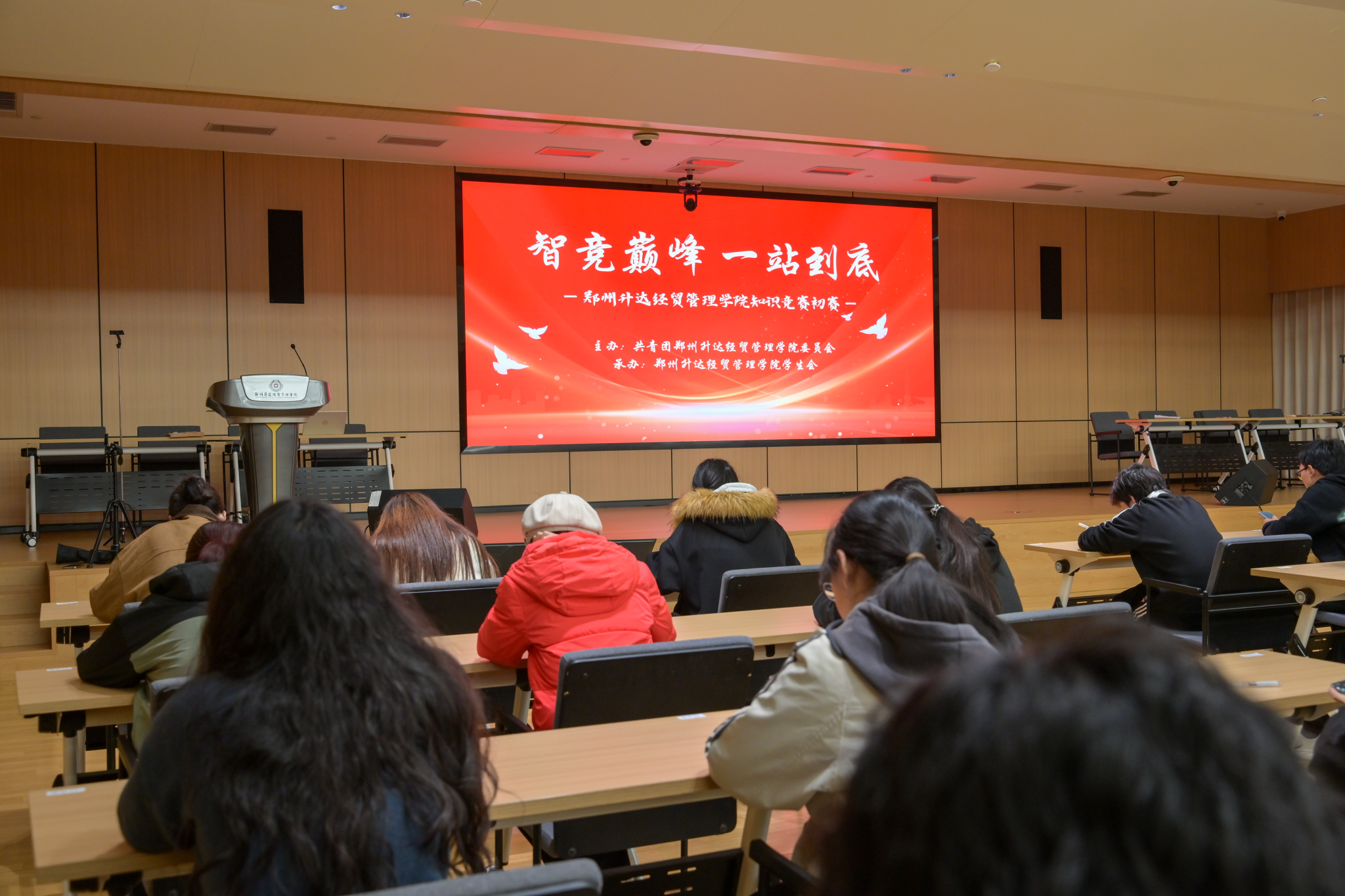 2025年11月6日晚,由校团委主办,校学生会学习部承办的“智竞巅峰,一站到底”知识竞赛初赛在新图书馆二楼第一报告厅顺利启幕。来自全校各学院的学子怀揣热忱与学识踊跃参与,齐聚一堂,在思维的交锋与智慧的碰撞中,演绎了一场精彩纷呈的学术竞技盛宴。
