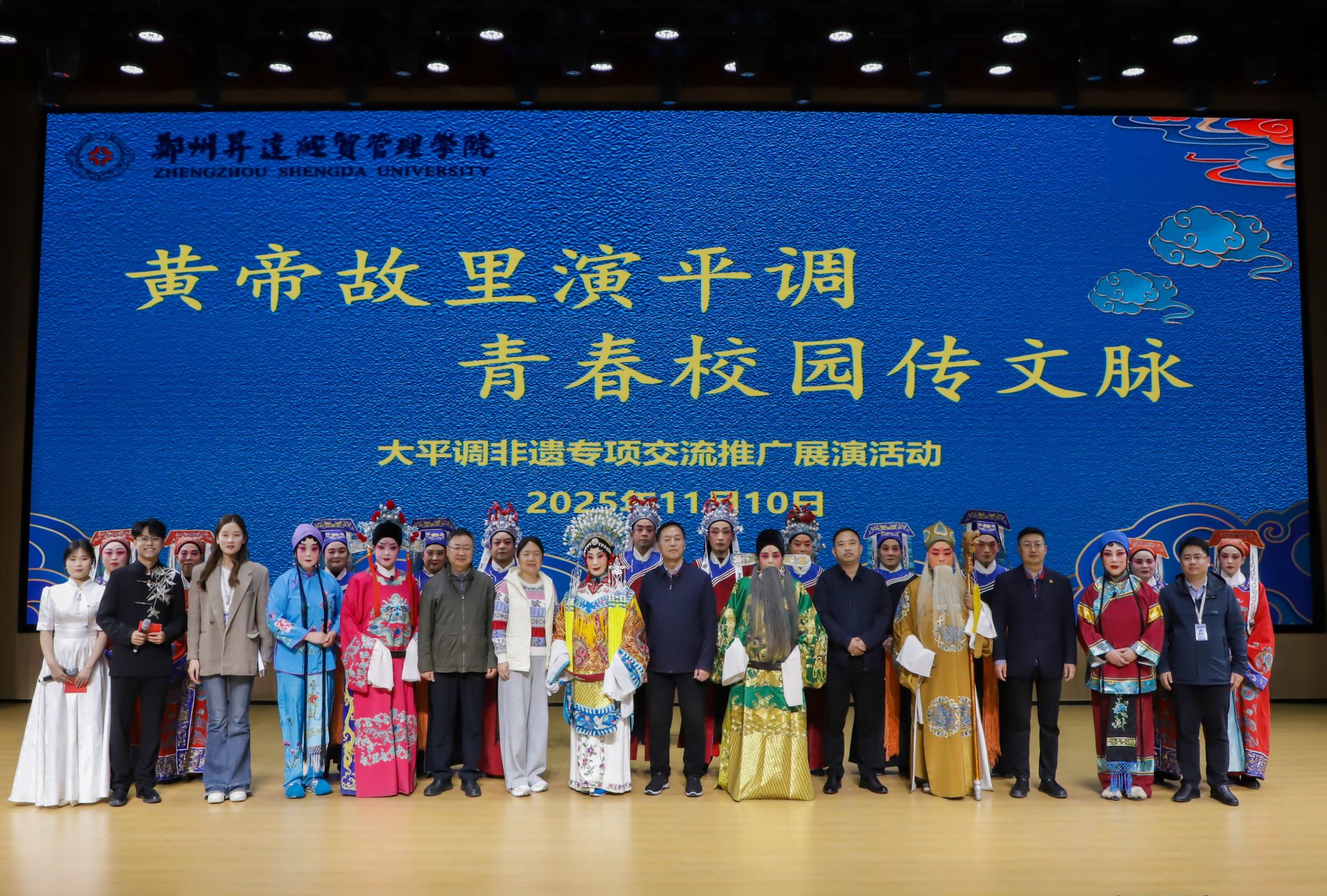 黄帝故里演平调,青春校园传文脉。在校监事会主席、登封校区党工委书记沈定军引荐协调下,11月10日,国家级非物质文化遗产滑县大平调剧团交流推广活动在我校新图书馆三号报告厅举行。河南省艺术档案中心主任裴小松,滑县文化广电体育旅游局党组成员、副局长张秀飞,滑县大平调剧团团长黄高飞、党支部书记邢宝军;我校党委副书记、副校长、工会主席张金安,董事会办公室主任杨存博,财务处处长张延霞,学科建设办公室主任李晓锋,校团委书记李霄锋等参加活动,与全校500余名师生一同沉浸于戏曲盛典之中。
