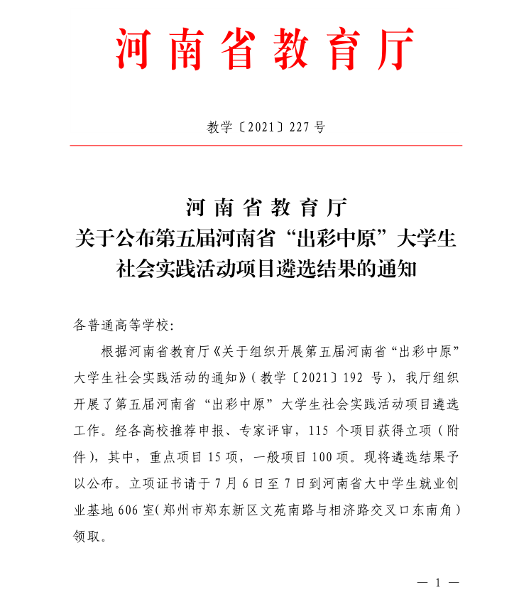 河南省教育厅于2021年5月下发了《关于组织开展第五届河南省“出彩中原”大学生社会实践活动的通知》,我校团委组织各学院参照文件,高标准遴选具有代表性的优秀社会实践项目,最终推选出三个项目进行申报。近期河南省教育厅下发了《关于公布第五届河南省“出彩中原”大学生社会实践活动项目遴选结果的通知》经各高校推荐申报、专家评审,全省共115个项目获得立项,其中我校“助力乡村振兴——升达学院‘青苗计划’实践团”、“‘扬中华传统,评氤氲茗香’志愿服务队”两个团队项目获批一般项目立项。