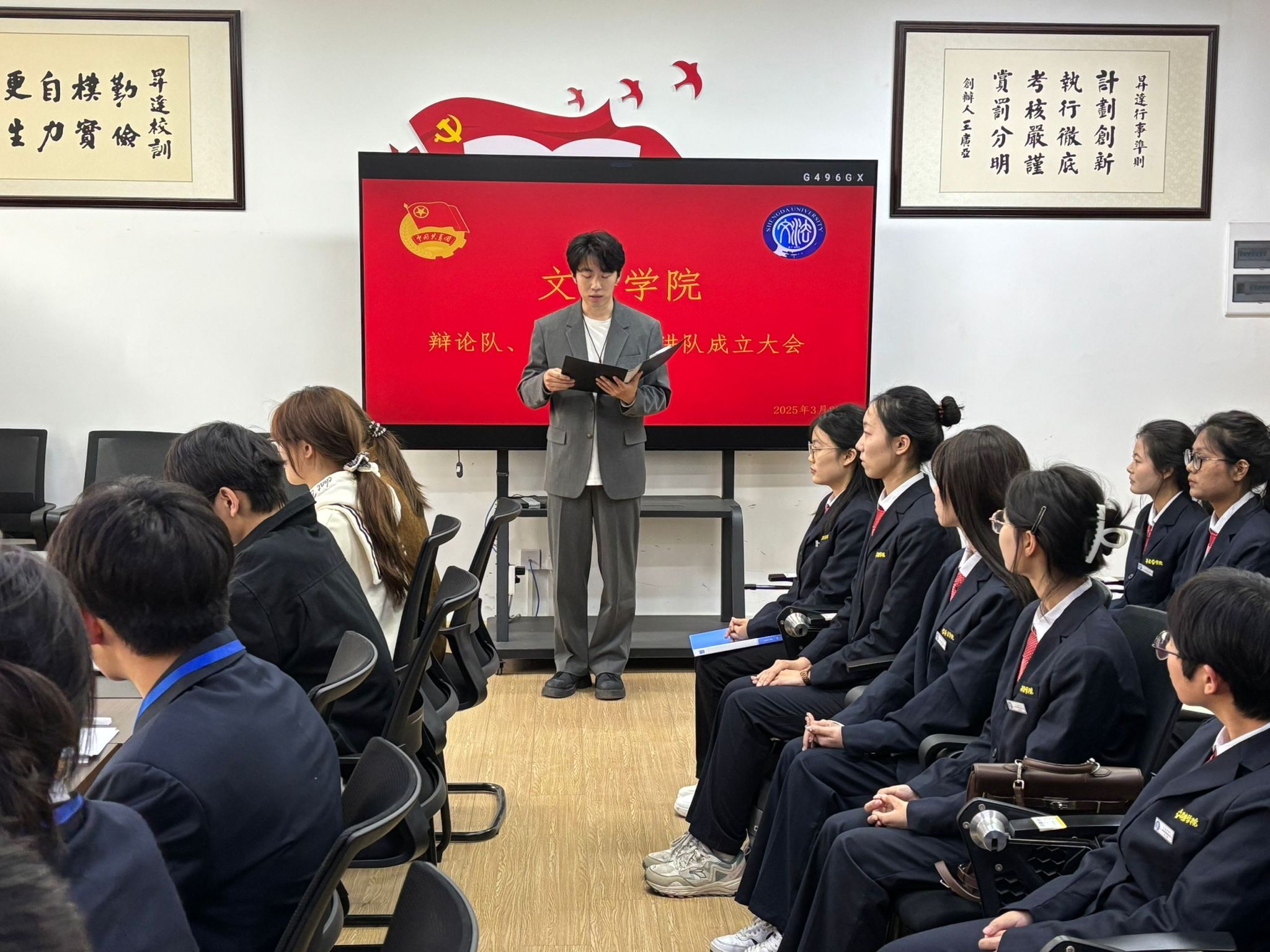 为增强文法学院主持队、辩论队、演讲队的凝聚力,促进队员之间的交流与进步,活跃大学生校园文化生活。3月27日,由文法学院团委主办,学生会学习部承办的主持队、辩论队、演讲队“三小队”成立大会在教学一号楼314教室举行。出席本次大会的嘉宾有文法学院院长、校语委办公室主任、校演讲与辩论协会指导老师段丰乐,文法学院团委书记郑玲玲,文法学院团委副书记于晔,辅导员杨玉兰、刘思宇、金阳、吴彦举、牛赛、刘唯伊。学习部全体部长及“三小队”成员到场参会。