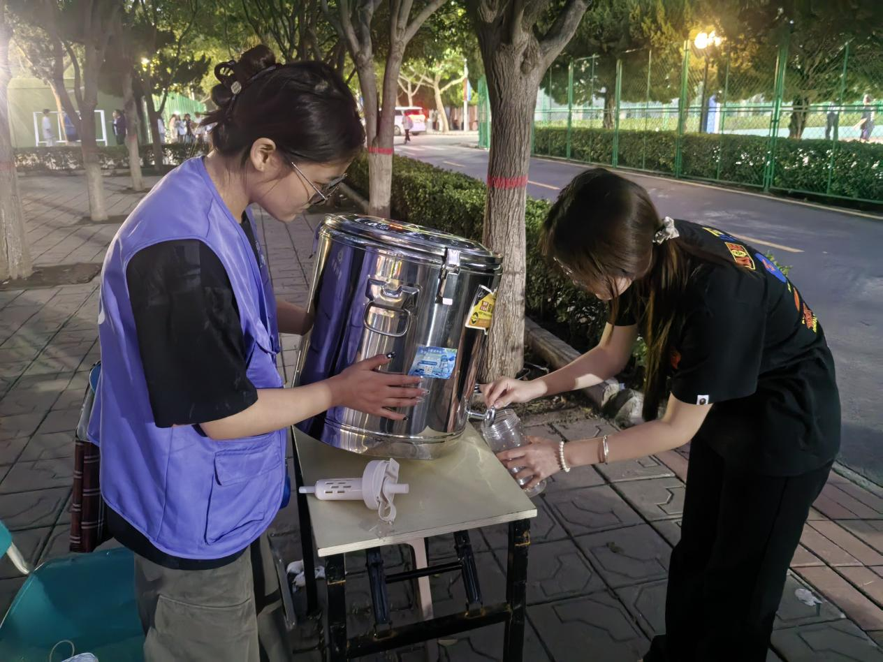 活动前期,管理学院团学会积极协调各部门,制定详细的轮值方案,明确各部门的服务时间与职责,确保值班点从早训到晚训全程“不断档”,为训练的新生提供全方位的保障。每日训练前半小时,轮值的志愿者便已携带饮用水、一次性水杯等物资抵达指定点位,快速完成物资摆放等准备工作;训练期间,志愿者们时刻关注水量消耗情况,一旦发现水桶见底,便第一时间更换,避免新生出现“等水喝”的情况;训练结束后,志愿者会主动清理现场垃圾,保持服务点环境整洁。