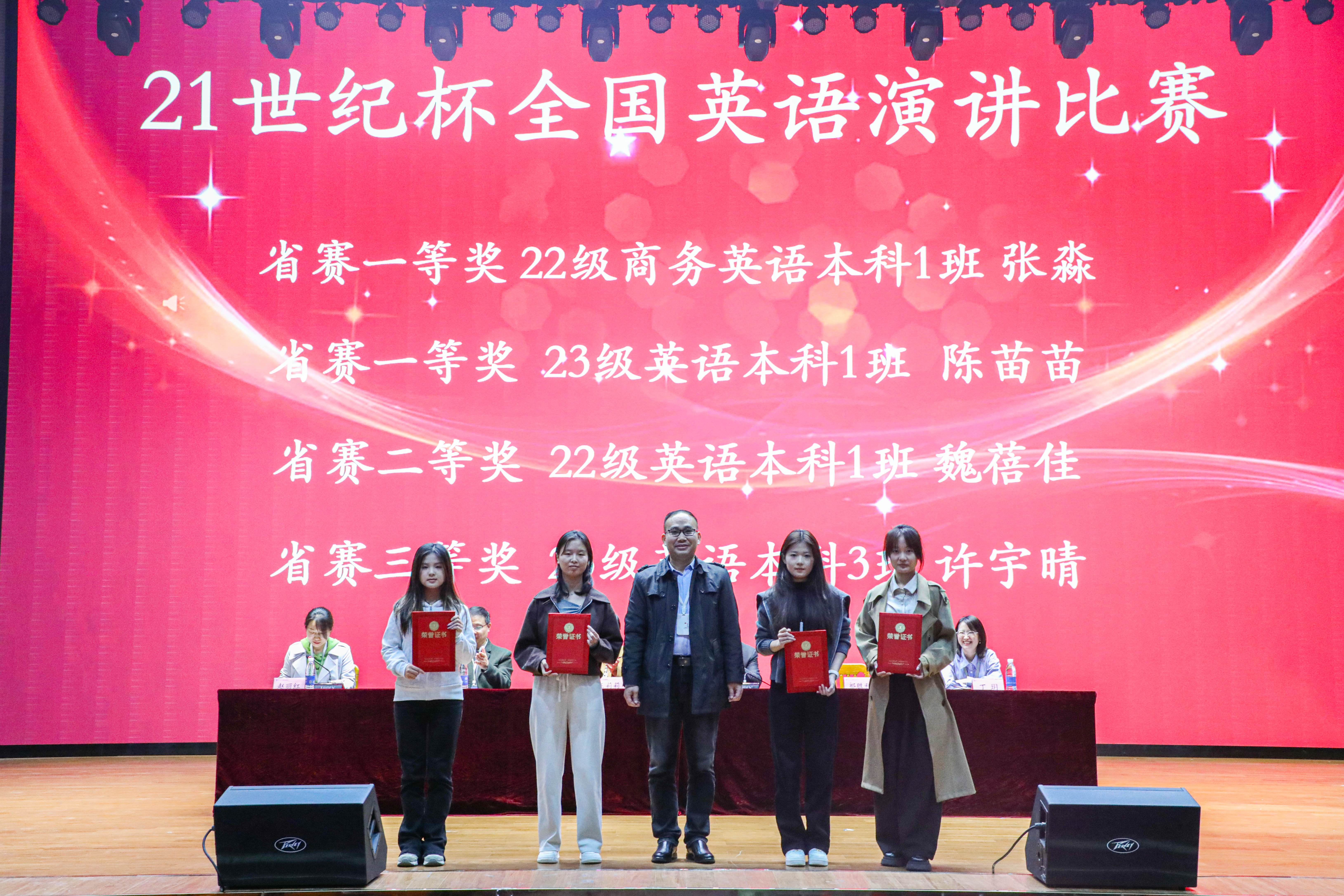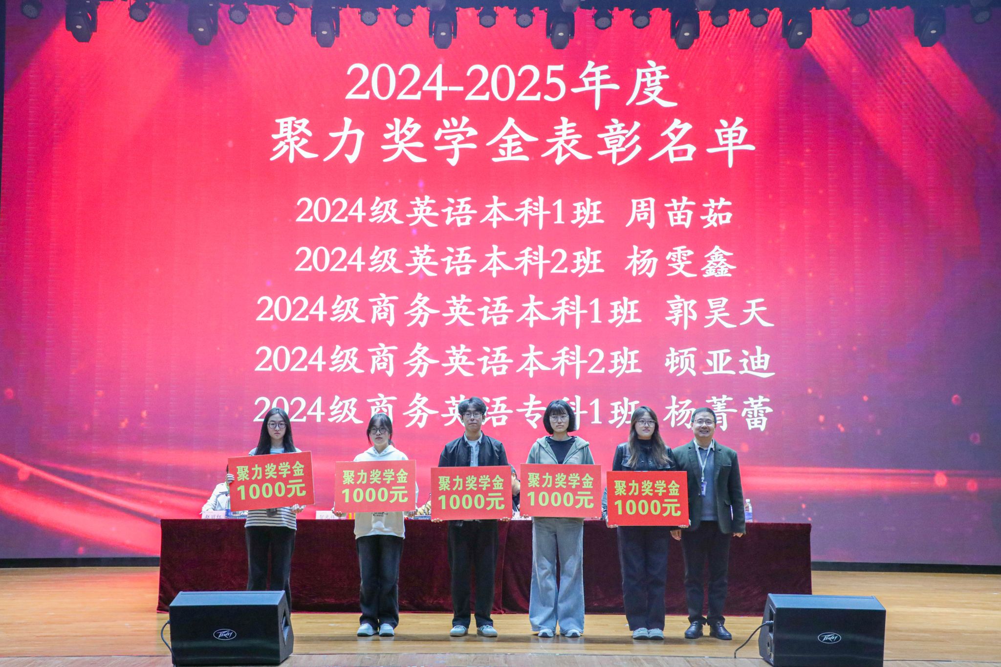 随后,大会进入表彰颁奖环节。现场对在各类专业竞赛中斩获省级及以上奖项的学子、2024-2025 年度聚力奖学金获得者、国家励志奖学金获得者及国家奖学金获得者予以表彰。其中,22 翻译本科 1 班申思羽获第三届 “外文奖” 全国大学生英语翻译大赛全国二等奖;22 级商务英语本科 1 班张淼、23 级英语本科 1 班陈苗苗获 21 世纪杯全国英语演讲比赛省级一等奖,22 级英语本科 1 班魏蓓佳获省级二等奖,23 级英语本科 3 班许宇晴获省级三等奖;2022 级英语本科 4 班景碧潭获国家奖学金。学院领导为获奖学生逐一颁发荣誉证书,现场掌声雷动,气氛热烈。