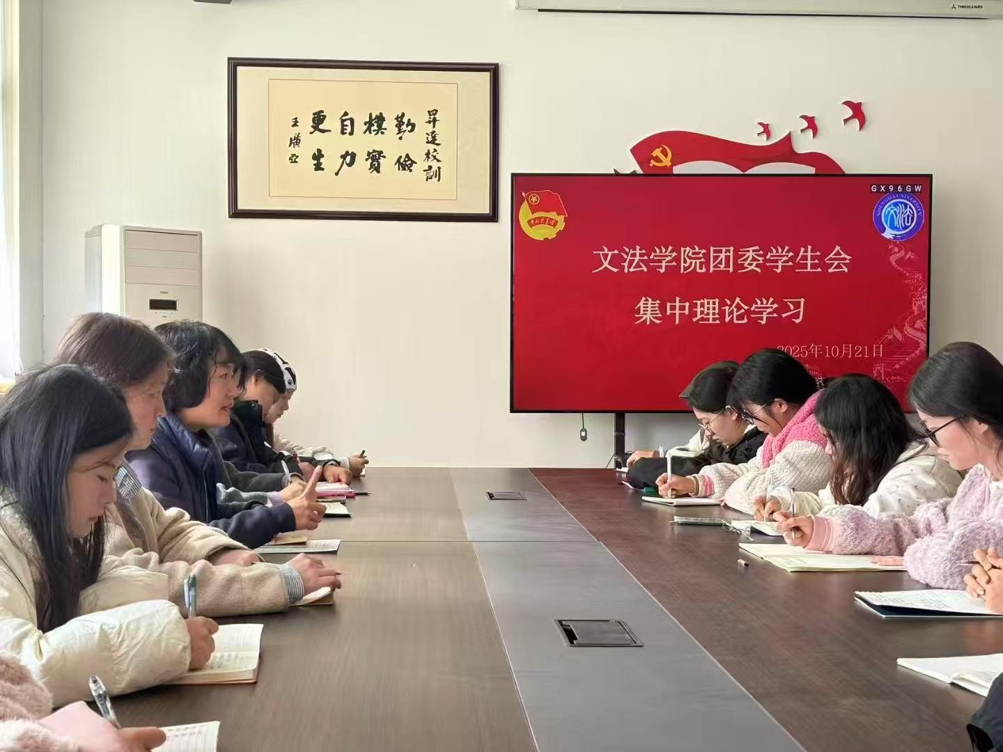 为明确新一届学生干部身份职责,提升思想理论水平,推动团委学生会、青年志愿者协会工作高质量开展,10月21日中午,文法学院第二十四届团委学生会、青年志愿者协会集中理论学习会议在教学1号楼314教室顺利召开。文法学院团委书记郑玲玲老师、第二十四届团委学生会主席团全体成员、全体部长以及青年志愿者协会全体成员参加本次会议。