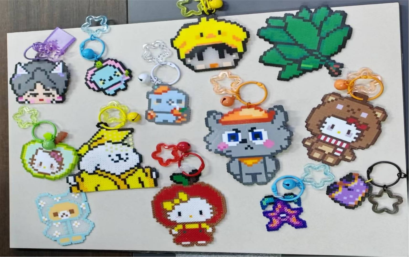 活动筹备阶段,指导老师周洁为大家准备了色彩丰富的拼豆颗粒、多样模板及工具包,既为新手提供“卡通人物形象”“小动物”等基础模板,也鼓励有创意的同学自由设计图案,满足不同同学的需求。活动过程中,同学们或独自专注创作,或三五成群交流技巧,指尖翻飞间,原本零散的彩色拼豆逐渐拼形成生动的图案:有象征勇气的“小太阳”,寓意直面生活的勇气;有俏皮可爱的“卡通合照”,定格同学间的真挚友谊;还有设计精巧的“字体”,尽显独特的文艺品味。社长付强表示:“拼豆时需要全神贯注,所有注意力都集中在手里的小豆子上,不知不觉就忘记了时间和生活中的一些焦虑。”最后,大家纷纷展示作品,分享创作时的心情。更有同学将作品赠予好友,让温暖与快乐在彼此间传递。