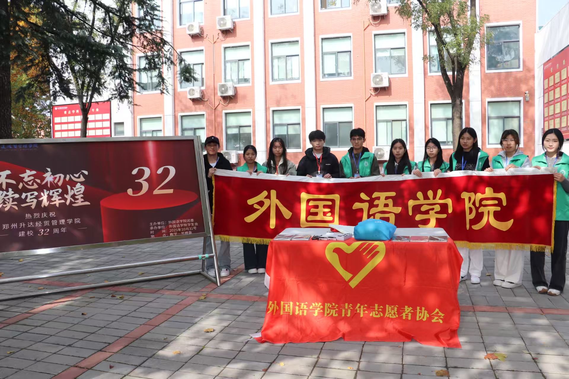 秋意渐浓,书香满园,在全校师生热切期盼母校建校三十二周年之际,为营造浓厚喜庆的校庆氛围,增进同学们对母校历史传统、规章制度与精神文化的认同与热爱,外国语学院青年志愿者协会于2025年10月31日在教学楼一楼南侧成功举办“追忆校史,共贺华诞”主题校园答题活动,吸引了大量在校学子踊跃参与。