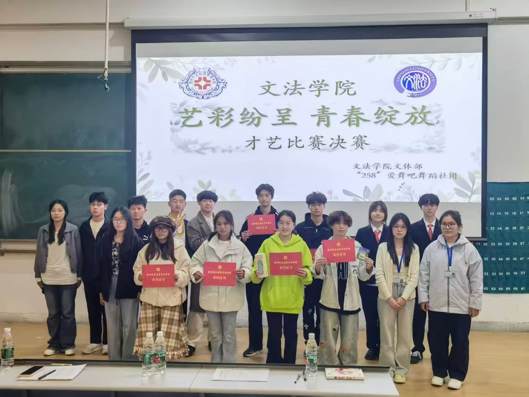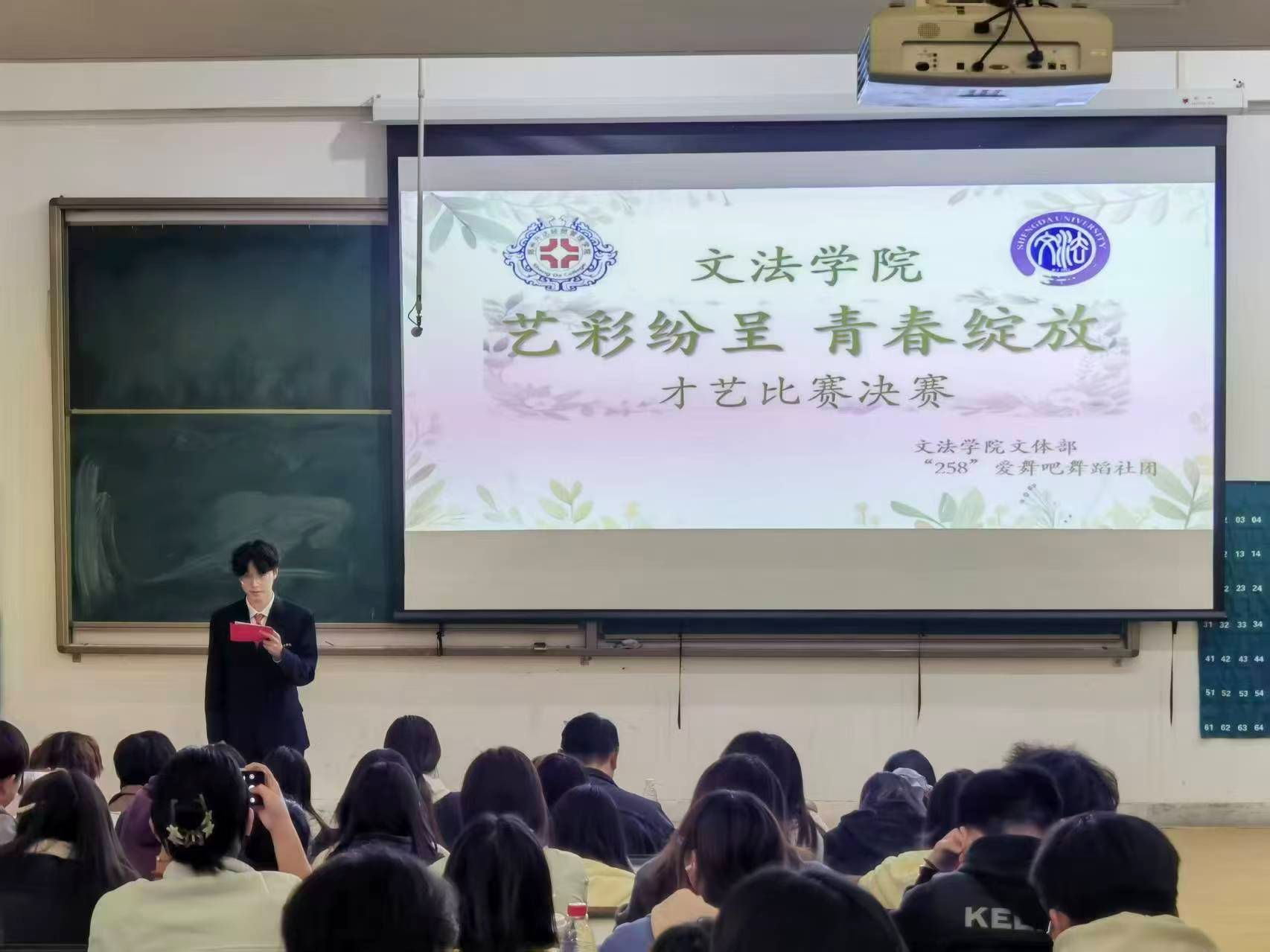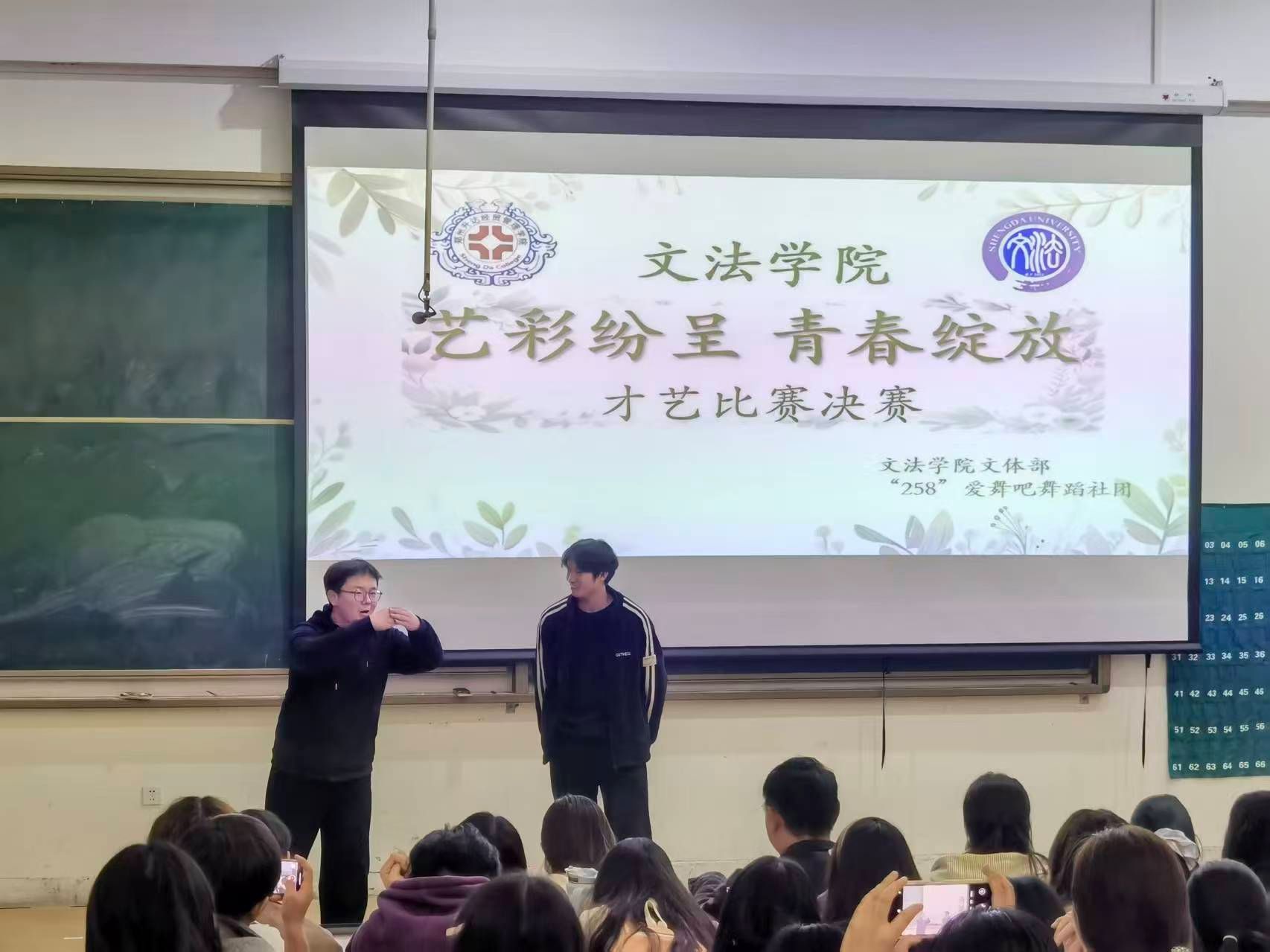 为营造良好的校园文化氛围,由文法学院团委学生会主办,文体部、“258”爱舞吧舞蹈社团承办的“艺彩纷呈,青春绽放”才艺比赛于11月3号下午6点半在教学1号楼118教室举办。出席本次活动的嘉宾有文法学院党委副书记郑玲玲老师,辅导员范瑞瑞老师,文法学院团委副书记张可欣、周琳婷,学生会主席石文佳,学生会副主席杨文静,第二十三届文体部副部长王尚衡,文法学院2025级部分学生到场观看比赛。