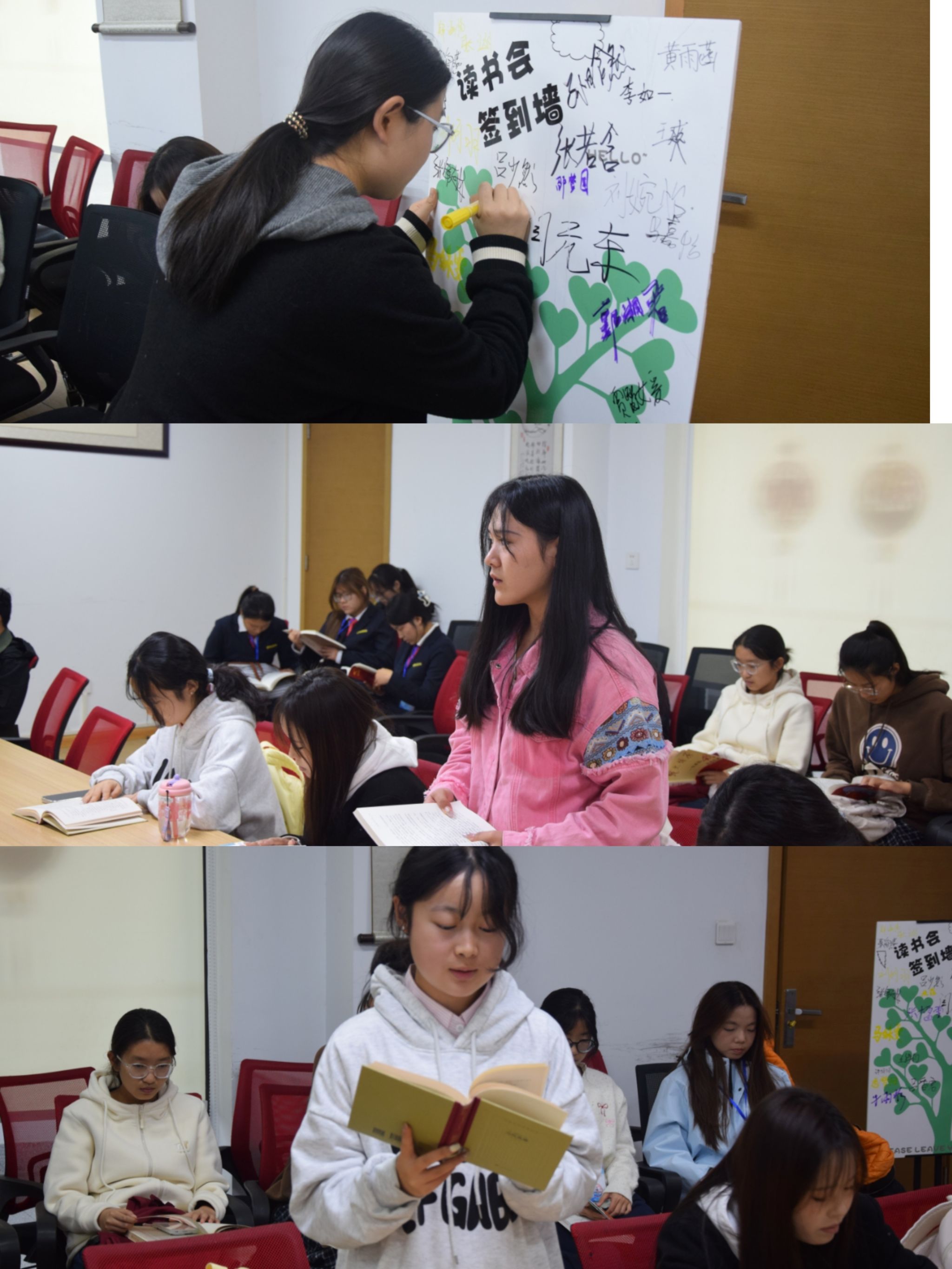 活动设经典共读、主题研讨两大环节,在同学们的依次签名中拉开序幕。大家围坐一堂,共同研读《中国共产党简史》《红岩》《人民的胜利》等红色经典,分享阅读感悟与体会。每一本书都宛如一扇通往历史的大门,让同学们深刻体悟到先辈们的坚定信念与无私奉献。
