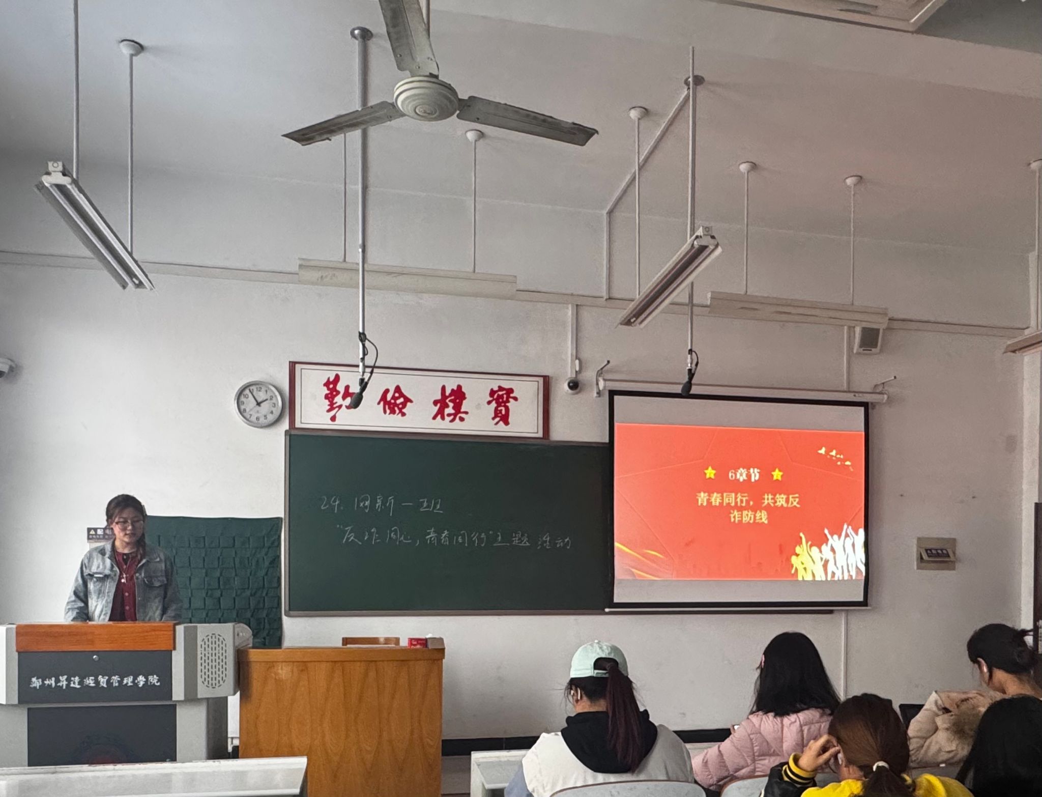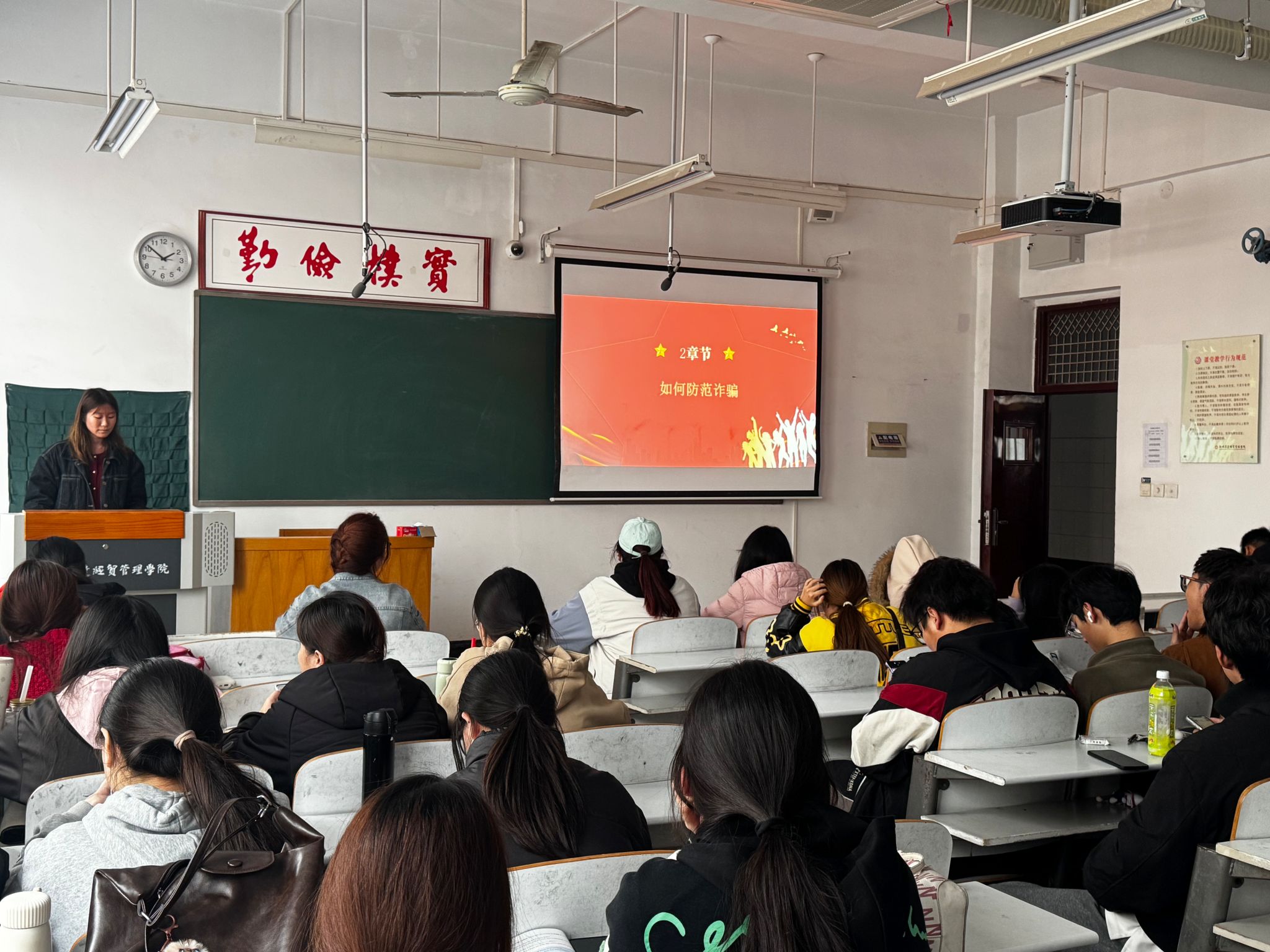 活动伊始,饶睿琪围绕“如何防范诈骗” 主题,聚焦 “刷单返利”“冒充客服” 等校园高发诈骗类型,从校园生活入手,拆解诈骗陷阱,传授识别技巧,解决实际问题。活动中同学们专注聆听并认真记录,在互动环节,同学们踊跃分享反诈见闻,探讨了日常生活中如何面对陌生账号转账等问题,并且提出了处理方式,深化了对诈骗套路的认知活动。活动尾声,饶睿琪总结强调青年学生既是反诈重点保护群体,也是宣传重要力量,鼓励大家活用反诈技巧并向亲友传递相关知识。