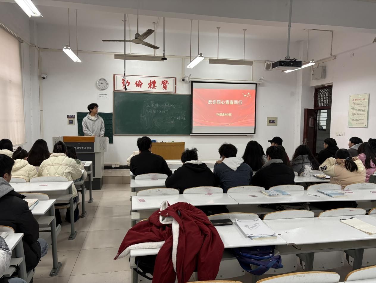 为进一步筑牢校园反诈安全防线,提升大学生防范电信网络诈骗的意识与能力,11月17日9:30,金贸学院24级金融学本科3班在时金楼210教室成功举办“反诈同心,青春同行”主题班会。