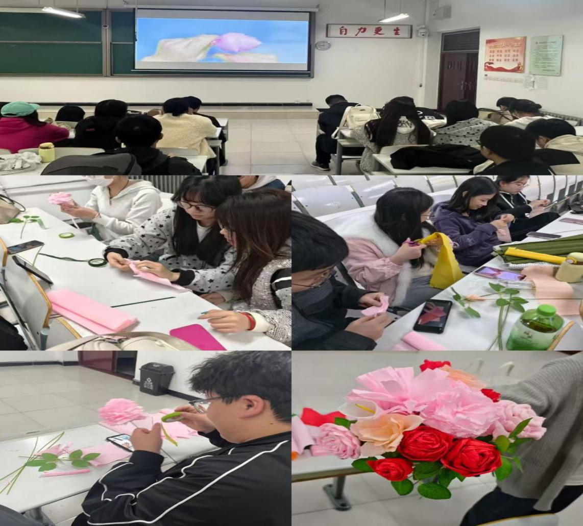 随后,活动进入实践环节,全班同学共同观看皱纹纸玫瑰花制作教学视频,认真学习花瓣裁剪、造型塑形、组装拼接等关键步骤,细致记录制作技巧。视频观看结束后,大家分工协作、相互配合,裁纸、卷边、粘贴有条不紊,过程中主动分享操作心得,互帮互助解决制作难题,现场氛围温馨热烈,充分展现班级团支部凝聚力与协作力。经过耐心创作,一朵朵形态饱满、精致美观的皱纹纸玫瑰花逐一成型,承载着大家的用心与诚意。