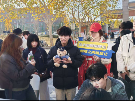 为加强校园安全教育,提升在校大学生对网络诈骗的认知水平,帮助学生了解常见诈骗手段及防范技巧,筑牢校园反诈防线。机电学院青年志愿者协会特邀请河南警察学院“重明净网”反诈社团与河南司法警官职业学院团委“藏蓝青春”志愿者协会于2025年11月29日进校园开展“慧识骗局·安护校园”校际联动反诈宣传活动。