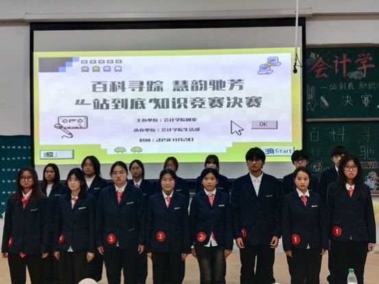 为激发会计学院学子对知识的渴望与探索,凝聚青春奋进力量,营造笃学笃行的文化氛围。经过前期的初赛选拔,11月27日19:00,由会计学院团委主办,会计学院生活部承办的“百科寻踪 慧韵驰芳”一站到底知识竞赛决赛在教学四号楼118教室隆重举行。出席本次活动的嘉宾有会计学院党委副书记兼团委书记陈刚老师以及会计学院第31届团学主要干部骨干,我院25级各班学生代表。