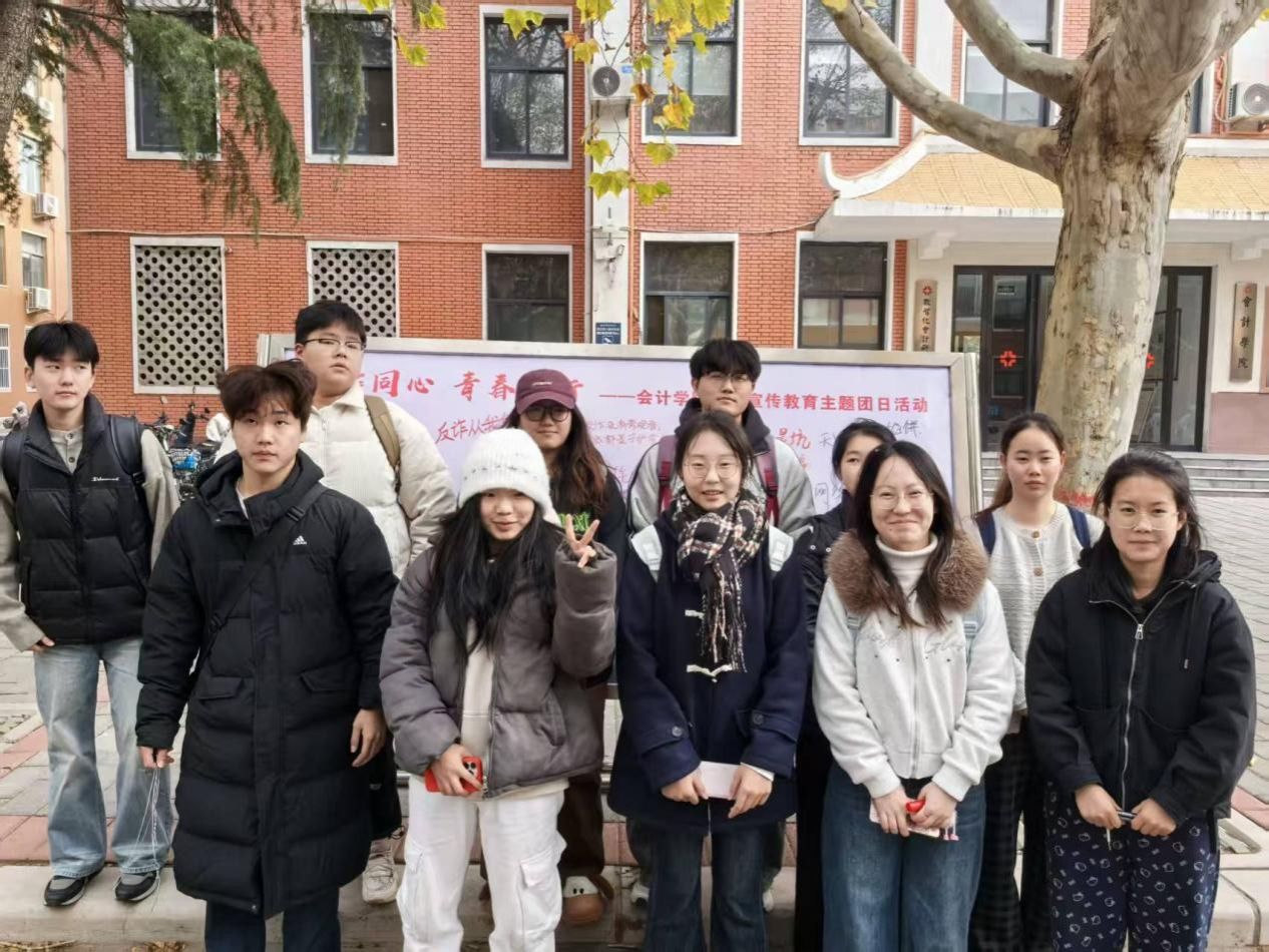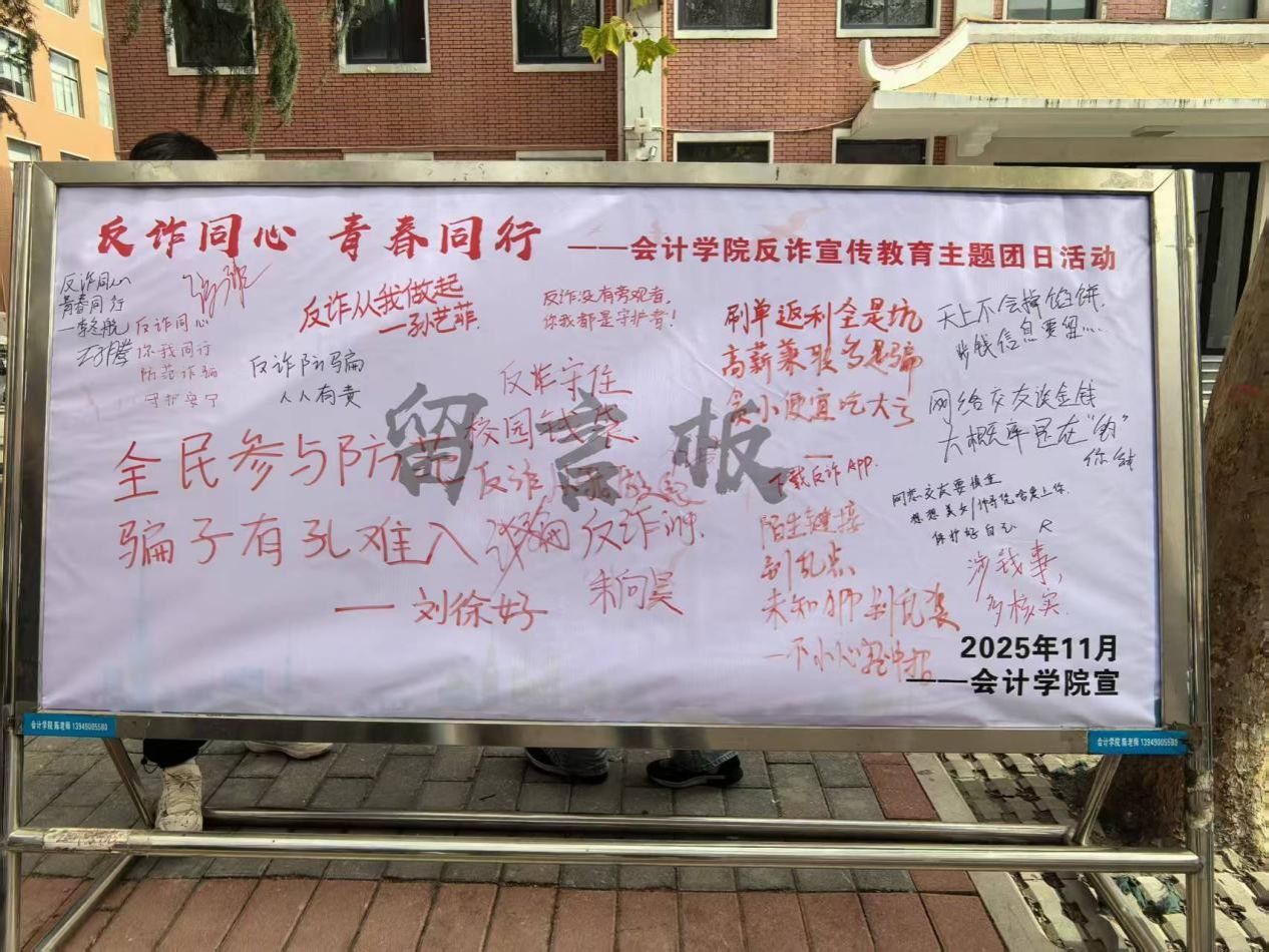 为提升会计学院学子防范电信诈骗的意识和能力,营造校园反诈防骗的浓厚氛围。11月24日,由会计学院团委主办的“反诈同心,青春同行”会计学院反诈宣传教育主题团日活动于教学四号楼外顺利开展。活动通过设置反诈主题展板、发起集体签名、征集反诈警示语等形式,吸引了会计学院广大青年学生的积极参与。