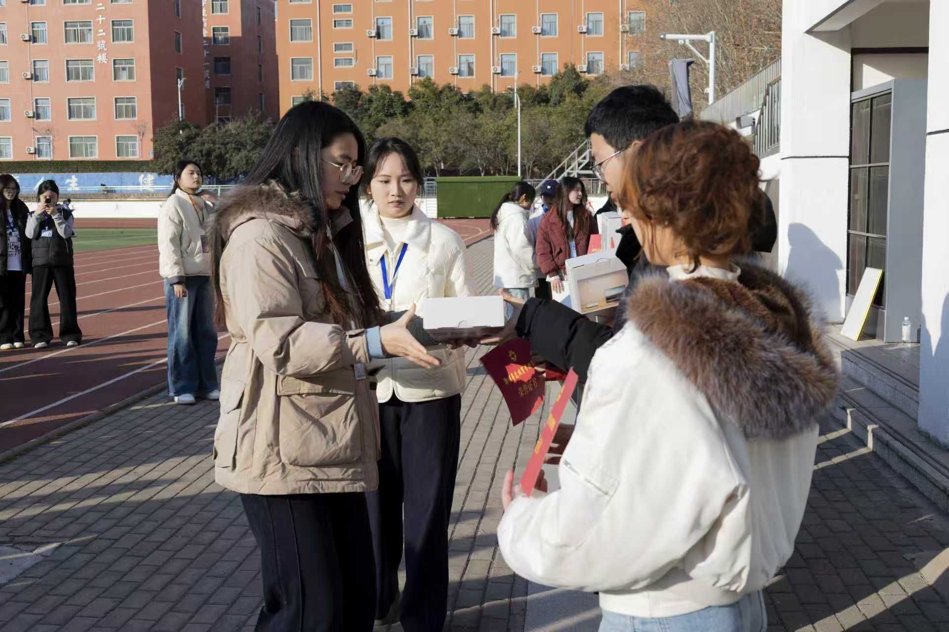 主持人讲解完比赛规则后,活动正式拉开序幕。“一圈到底”环节中,队员们手拉手默契配合,呼啦圈在队列中如游蛇般灵活穿梭;“进击的石头剪刀布”赛场,跳跃与猜拳轮番上演,胜负之间尽显新时代青年的青春与活力;“多人多足”项目中,各队步调一致、协同向前,摔倒后迅速起身的身影,淋漓尽致地诠释着永不言弃的拼搏精神;“猜词”环节,描述者巧妙运用动作与语言提示,猜词手们反应敏捷、默契配合,在欢声笑语中凝聚思想共识,传承爱国初心;“毽子游戏”时,彩色毽子在队员们脚尖、膝盖间轻盈跳跃,传递着新时代团干部互帮互助、协同共进的喜悦。经过激烈角逐,最终第七组拔得头筹,荣获一等奖,第四组摘得二等奖,第九组获得三等奖,其余参赛队伍均获优秀奖,党委副书记郑玲玲、团委副书记于晔和团委副书记袁艺阁为获奖选手颁奖。
