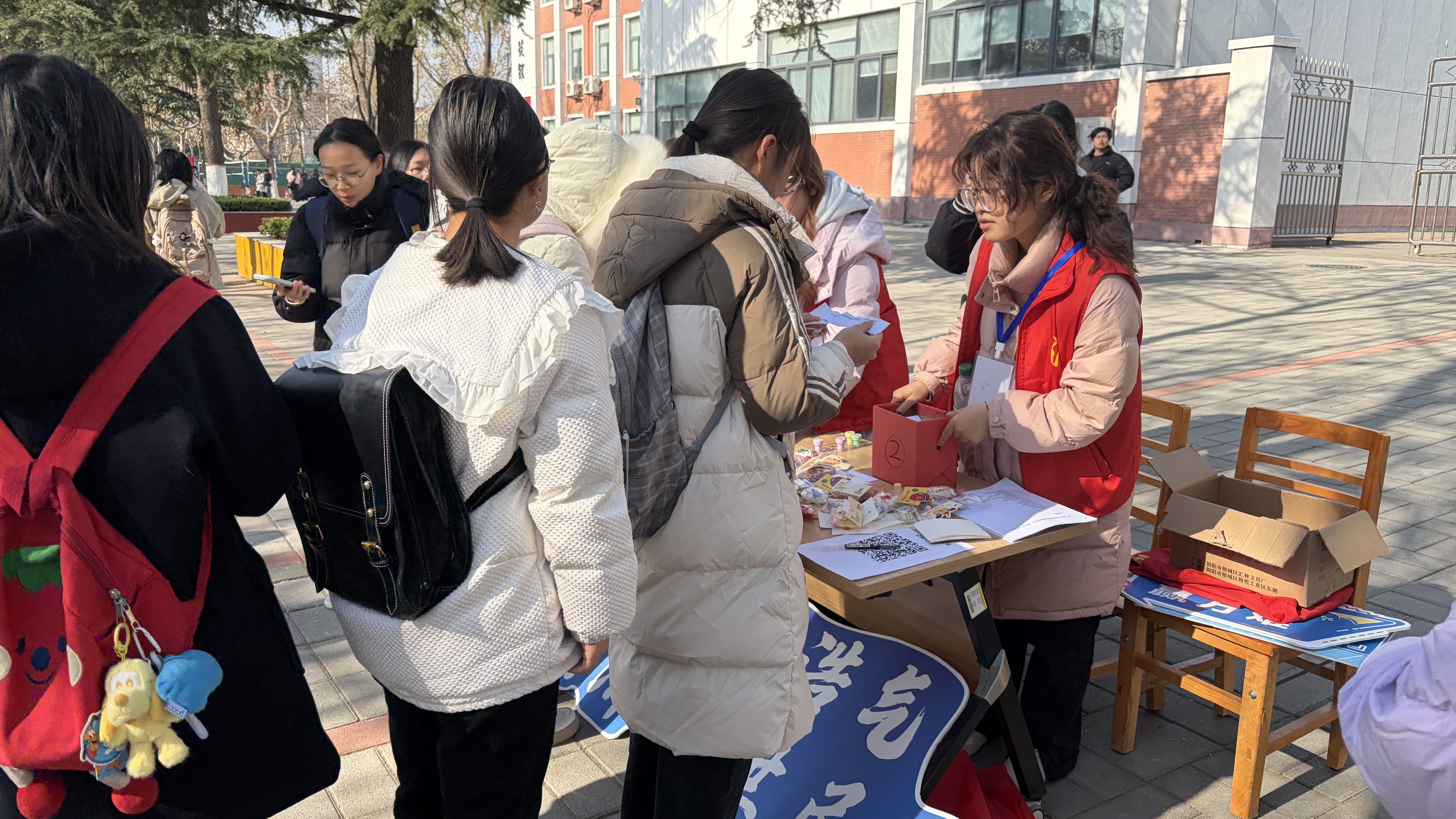 活动现场精心打造了“案例速答站”与“口诀打卡站”两大互动环节,采用“沉浸式体验+趣味互动”的模式,使普法宣传变得生动活泼、趣味盎然。参与者首先登记个人信息并领取专属闯关凭证,随后进入第一站“案例速答站”,同学们从“法治盲盒”中随机抽取校园常见案例卡片,在限定时间内快速分析并精准指出相关侵权行为,回答正确即可赢得首枚通关印章。紧接着的第二站“口诀打卡站”中,参与者自由选择普法顺口溜进行流利背诵,并手持特色法治宣传牌拍照留念。完成朋友圈分享与话题互动后,经工作人员核实即可加盖第二枚印章。集齐两枚印章的同学现场兑换了精美纪念品,让法治记忆深深融入日常生活。