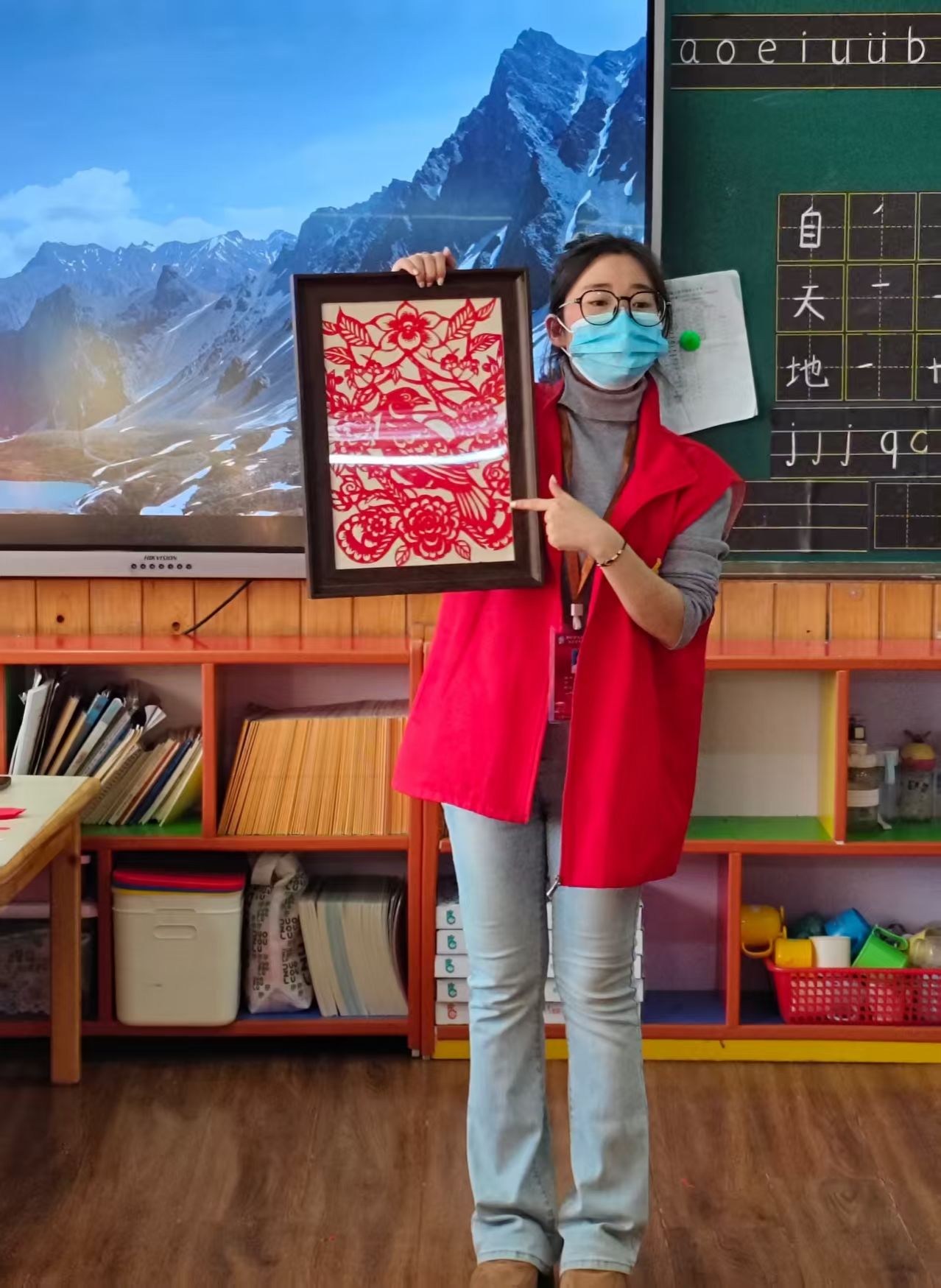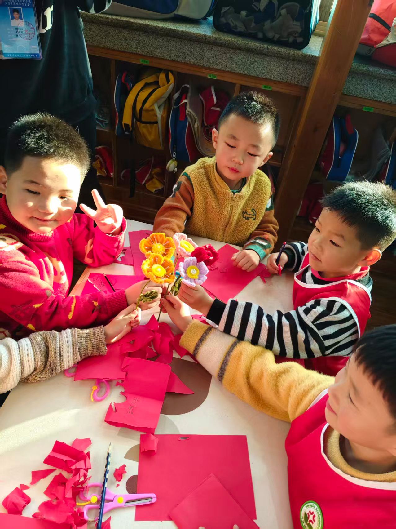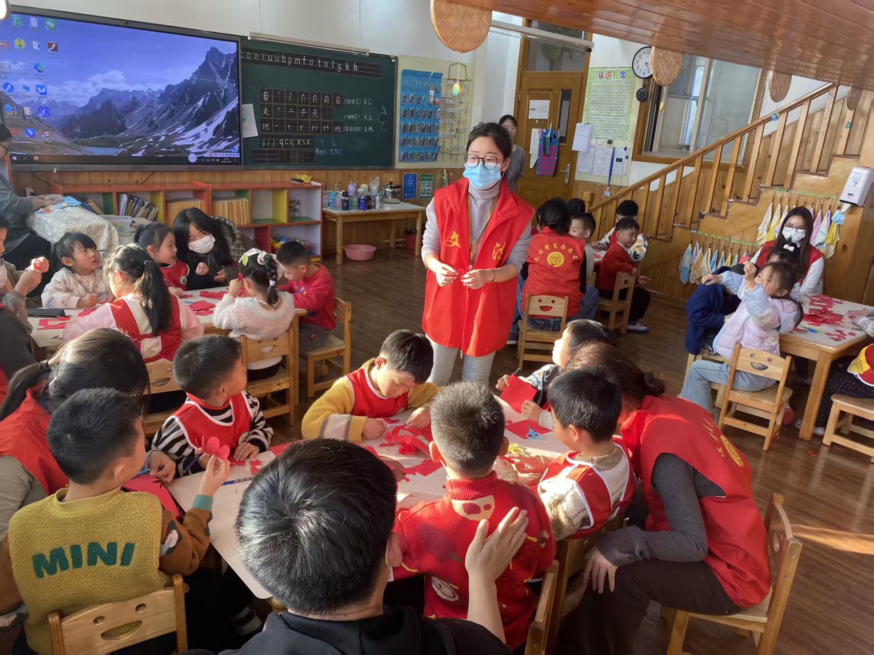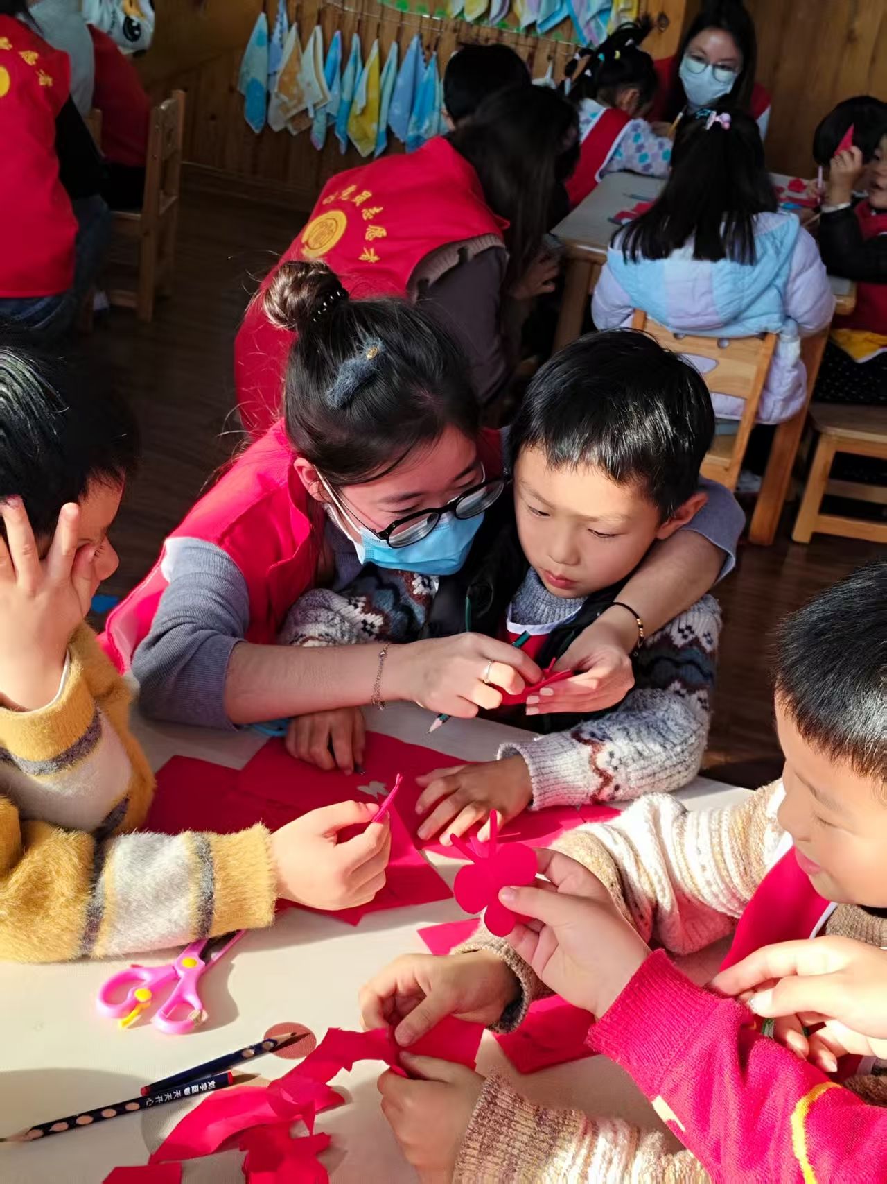 在孩子们完全熟悉并放松后,活动在负责人充满温暖的话语中拉开序幕,负责人向志愿者们详细介绍了活动流程、核心环节以及安全注意事项。接着,在互动环节,志愿者们以分组形式开展多维陪伴:聚焦于非物质文化遗产——剪纸,深入挖掘其文化内涵,带领幼儿体验安全且易于操作的传统剪纸技艺,用彩纸剪裁出呆萌的小动物、可爱的窗花等简易造型。志愿者们边示范边用充满童趣的语言讲解:“剪纸是老祖宗传了千百年的手艺,这些小图案里藏着好多美好的祝福哦”,让孩子们在动手创作中触摸传统、感受无限乐趣。同时穿插趣味互动游戏,歌声与笑声交织成一片,现场始终洋溢着温馨愉悦的笑容。最后,志愿者们拿出提前准备好的精美绒花礼品送给孩子们,孩子们也怀着雀跃的心情将承载着自己的创意与劳动的剪纸作品赠予志愿者们,表达他们纯真无邪的喜爱之情。