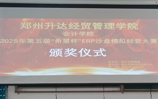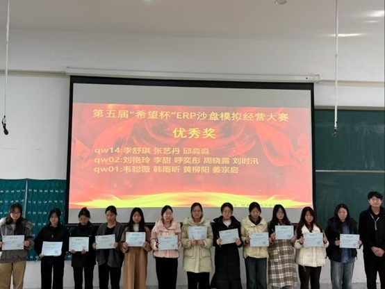 为培养学生的专业能力和综合素质,提升会计学子理论联系实践的能力,11月29日,由会计学院团委主办,会计学院ERP沙盘协会承办的第五届“希望杯”ERP沙盘模拟经营大赛在商管楼312教室举办,并于12月3日在教学四号楼118教室举办了颁奖仪式。参与此次颁奖仪式的嘉宾有会计学院党委副书记兼团委书记陈刚老师,会计学院团委副书记胡淑娟老师,ERP沙盘协会指导老师崔杰老师,社团管理中心主任孙翱以及社团管理中心副主任王莹。
