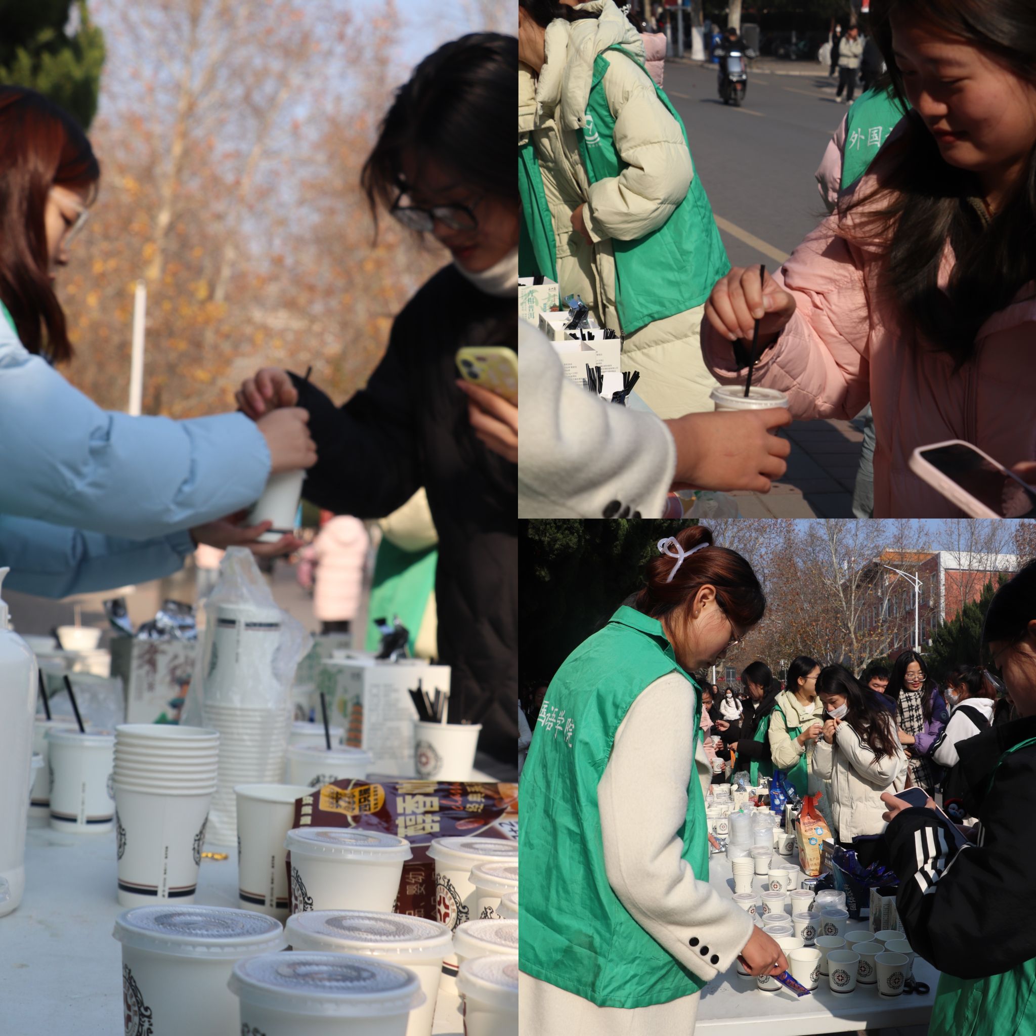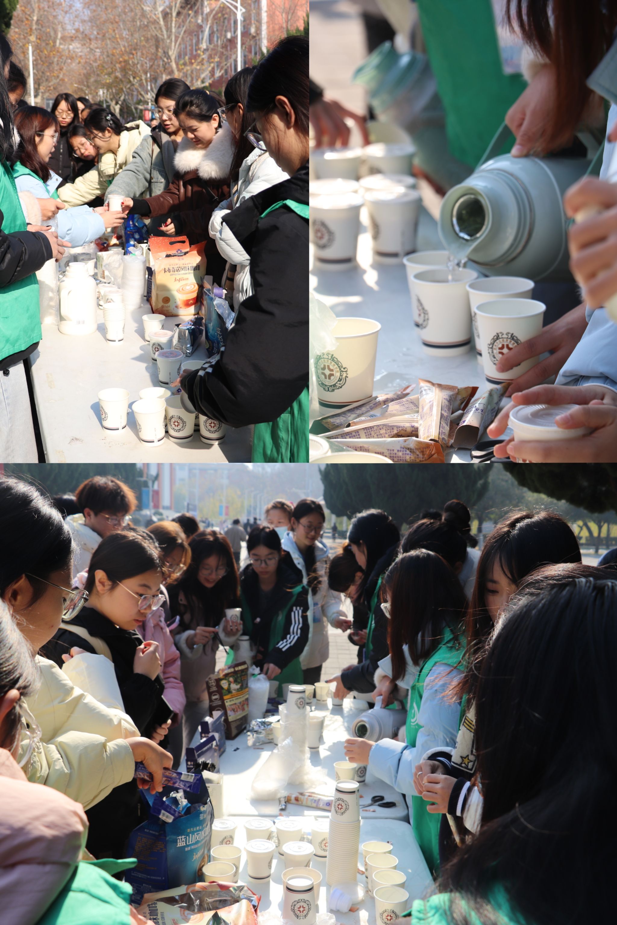 活动现场气氛热烈,志愿者们支起的茶摊前迅速排起了长龙。保温桶内茶饮种类繁多,既有提神的咖啡、清甜的蜂蜜柚子茶,也有暖身的红糖姜茶、醇香的红枣桂圆茶,轮番供应,满足不同口味需求。氤氲的热气裹挟着茶香在寒风中弥漫开来,令人倍感温馨。志愿者们一边递上热腾腾的纸杯,一边送上“注意保暖”“考试顺利”的贴心叮嘱,轻松的闲聊让现场氛围更加热闹温馨。