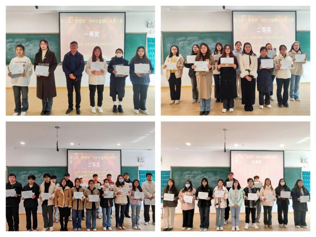为了对取得优异成绩的选手进行表彰,会计学院于12月6日在教学楼4号楼108教室举行颁奖仪式。会计学院行政秘书兼团委书记陈刚老师、会计学院团委副书记胡淑娟老师、会计学院心理辅导站站长、辅导员蔡艳丽老师、ERP沙盘协会指导老师张瑞娅老师分别对荣获一等奖、二等奖、三等奖和优秀奖的队伍进行了颁奖。
